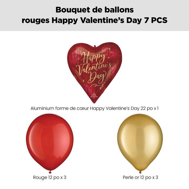 Contenu de l'ensemble : 1 ballon en forme extraordinaire rouge de 22 po Happy Valentine's Day (UCS 8551502), 3 ballons ronds en latex rouges de 12 po (UCS 8421414) et 3 ballons en latex nacrés dorés de 12 po (UCS 8421426)