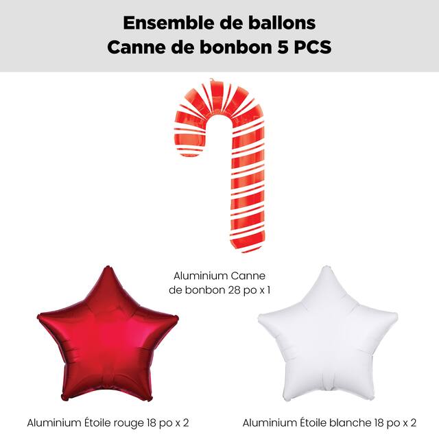 Contenu de l’ensemble : 1 ballon géant en forme de de canne de bonbon de 28 po (UCS 843-1369), 2 ballons en aluminium blancs en forme d’étoile de 18 po (UCS 842-3948) et 2 ballons en aluminium rouges en forme d’étoile de 18 po (UCS 842-3945)
