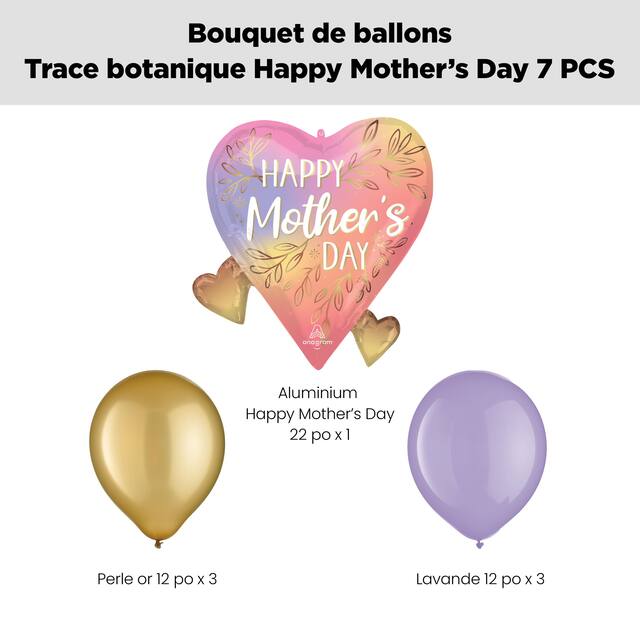 Contenu de l’ensemble : 1 ballon en forme super en forme de cœur à motif floral « Happy Mother’s Day » de 22 po (UCS 8551525), 3 ballons en latex nacrés dorés de 12 po (UCS 8421426) et 3 ballons en latex ronds lavande de 12 po (UCS 8421404)