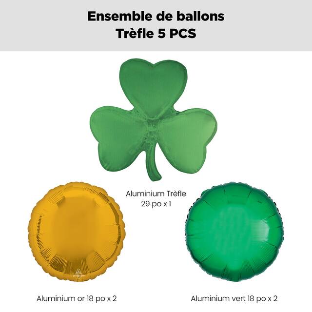 Contenu de l’ensemble : 1 ballon en forme super en forme de trèfle à quatre feuilles de 29 po (UCS 8431578), 2 ballons ronds en aluminium vert de 18 po (UCS 8431999) et 2 ballons ronds en aluminium dorés de 18 po (UCS 8423908)