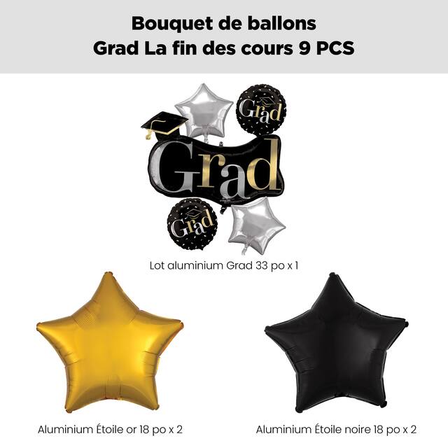 • Contenu de l’ensemble : 1 ballon en forme super classe terminée « Grad » de 30 po (UCS 8551533), 2 ballons assortis de 18 po et 2 ballons étoiles argentés de 18 po, 2 ballons étoiles en aluminium noirs de 18 po (UCS 8423875) et 2 ballons étoiles en aluminium dorés de 18 po (UCS 8423946)