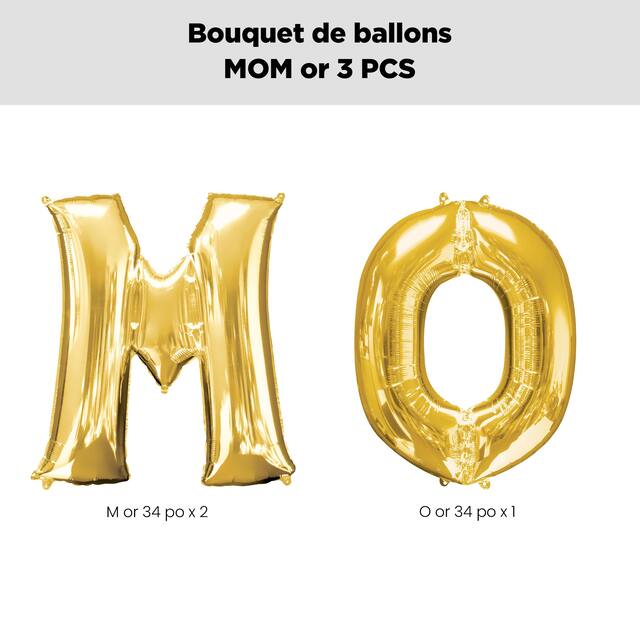 Célébrez maman lors de sa journée spéciale avec ce bouquet de ballons en lettres métalliques. Avec 3 ballons en lettres métalliques de 34 po dorés, ce bouquet de 3 pièces donnera le sourire à maman et la fera se sentir spéciale toute la journée.