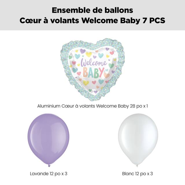 Contenu de l'ensemble : 1 ballon forme super en forme de coeur avec volants Welcome Baby de 28 po (UCS 8534188), 3 ballons ronds en latex lavande de 12 po (UCS 8421404) et 3 ballons en latex blancs de 12 po (UCS 8421406)