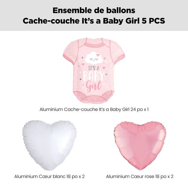 Contenu de l'ensemble : 1 ballon forme super It's a Baby Girl Onesie de 24 po (UCS 8534196), 2 ballons en aluminium en forme de coeur rose pastel de 18 po (UCS 8424235) et 2 ballons en aluminium en forme de coeur blancs de 18 po (UCS 8423887)