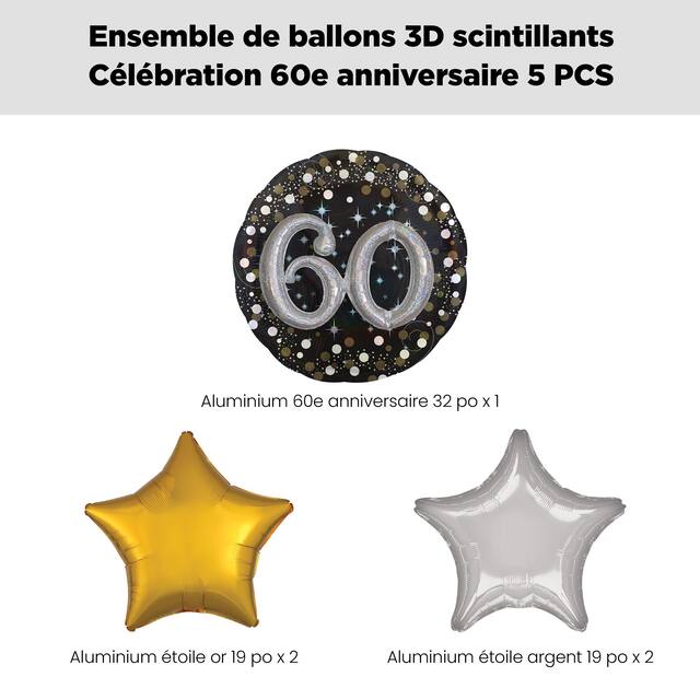 Contenu de l'ensemble : 1 ballon géant 3D célébration étincelante 60th Birthday de 32 po (UCS 8423986), 2 ballons en aluminium en forme d'étoile dorée de 18 po (UCS 8423946) et 2 ballons en aluminium en forme d'étoile argentée de 18 po (UCS 8423944)