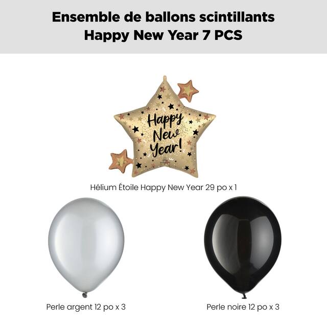 Contenu de l'ensemble: 1 ballon géant à effet métallique satiné étoiles scintillantes Happy New Year 29 po (UCS 8553370), 3 ballons en latex nacrés argentés 12 po (UCS 8421425) et 3 ballons ronds en latex noirs 12 po (UCS 8421408)