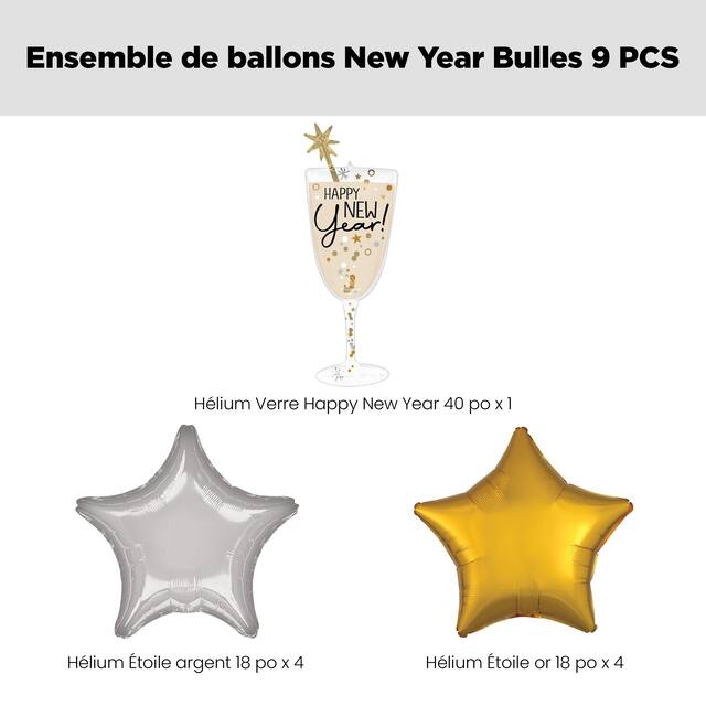Contenu de l'ensemble: 1 ballon géant métallique satiné verre à champagne Happy New Year 40 po (UCS 8553371), 4 ballons métalliques étoilés argentés 18 po (UCS 8423944) et 4 ballons métalliques étoilés dorés 18 po (UCS 8423946)