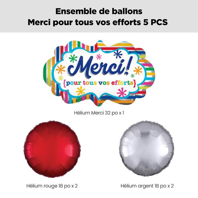 Contenu de l'ensemble: 1 ballon géant rond métallique satiné Merci pour tous vos efforts de 32 po (UCS 8546019), 2 ballons ronds métalliques argentés de 18 po (UCS 8423906) et 2 ballons métalliques rouges ronds de 18 po (UCS 8423907)