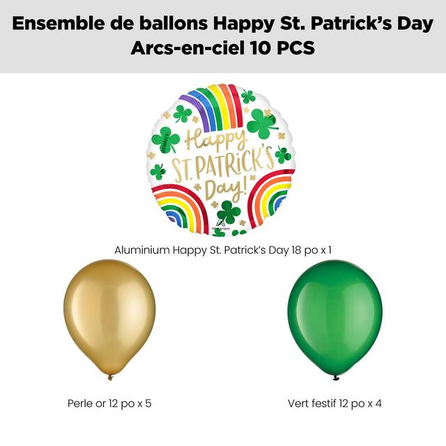 Contenu de l’ensemble : 1 ballon « Happy St. Patrick’s Day! » de 18 po (UCS 8542342), 4 ballons ronds en latex vert festif de 12 po (UCS 8421403) et 5 ballons en latex nacrés dorés de 12 po (UCS 8421426)