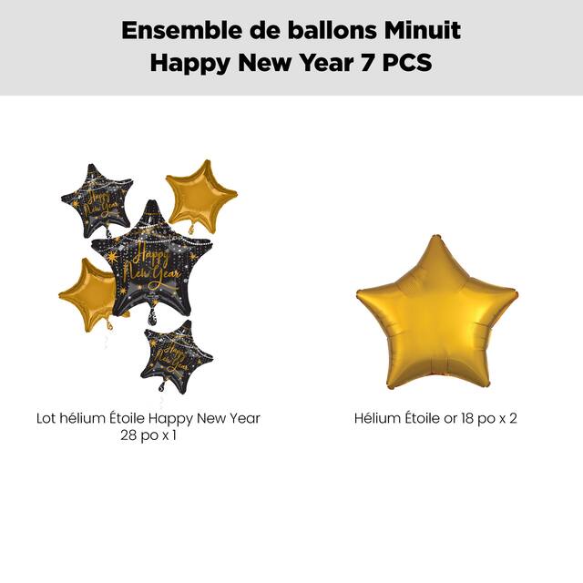 Contenu de l'ensemble: 1 ballon étoilé de 28 po Happy New Year Midnight Hour, 2 ballons étoilés de 18 po Happy New Year Midnight Hour et 4 ballons métalliques étoilés dorés de 18 po (UCS 8548813)