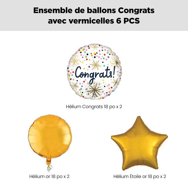 Contenu de l'ensemble: 2 ballons métalliques satinés ronds à pois et confettis de 18 po Congrats (UCS 8551374), 2 ballons ronds métalliques dorés de 18 po (UCS 8423908) et 2 ballons métalliques étoilés dorés de 18 po (UCS 8423946)