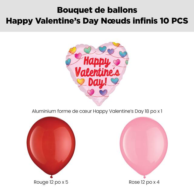 Bouquet de ballons noeuds infinis Happy Valentine's Day! avec ballons en latex, rouge/rose, paq. 10, gonflage à l'hélium et ruban inclus