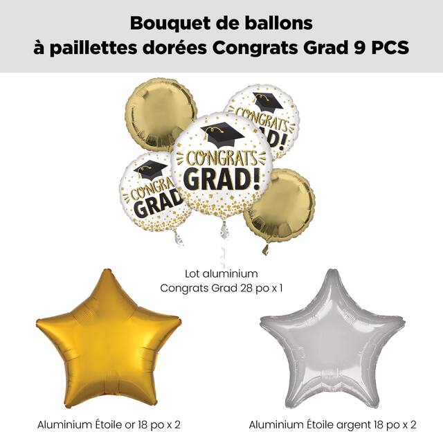 Contenu de l’ensemble : 1 ballon « Congrats Grad! » paillettes dorées de 28 po (UCS 8443067), 2 ballons standard Congrats Grad, paillettes dorées de 18 po et 2 ballons ronds en aluminium dorés de 18 po, 2 ballons étoiles en aluminium dorés (UCS 8423946) et 2 ballons étoiles en aluminium argentés de 18 po (UCS 8423944)