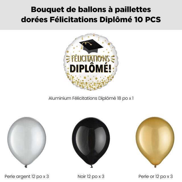 Contenu de l’ensemble : 1 ballon « Félicitations Diplôme! » paillettes dorées de 18 po (UCS 8443111), 3 ballons en latex ronds noirs de 12 po (UCS 8421408), 3 ballons en latex nacrés dorés de 12 po (UCS 8421426) et 3 ballons en latex nacrés argentés de 12 po (UCS 8421425)