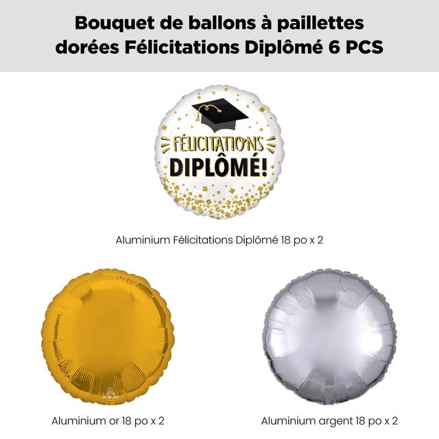 Contenu de l’ensemble : 2 ballons « Félicitations Diplôme! » paillettes dorées de 18 po (UCS 8443111), 2 ballons ronds en aluminium dorés de 18 po (UCS 8423908) et 2 ballons ronds en aluminium argentés de 18 po (UCS 8423906)