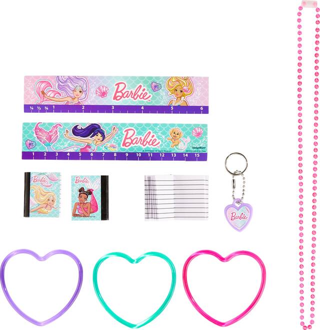 Comprenant des mini carnets de composition, des bracelets en forme de coeur, des règles, des porte-clés, des colliers de perles et des bagues dotées de la sirène Barbie et de ses amies