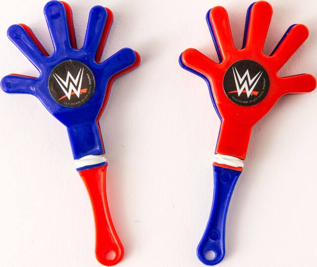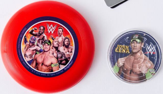 Comprenant des casse-tête labyrinthe avec une image de John Cena, des mini lance-disques rouges dotés d'images des meilleurs lutteurs, des toupies rouges, des claquettes pour les mains bleues et rouges dotées du logo « W », des balles de ping-pong de couleur rouge et bleu unis et des portées prismatiques avec des images imprimées enveloppantes de vos lutteurs favoris