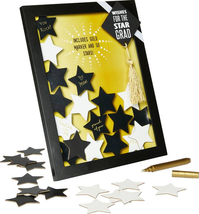 Affiche le titre « Wishes For The Star Grad » sur un chapeau de finissant attaché