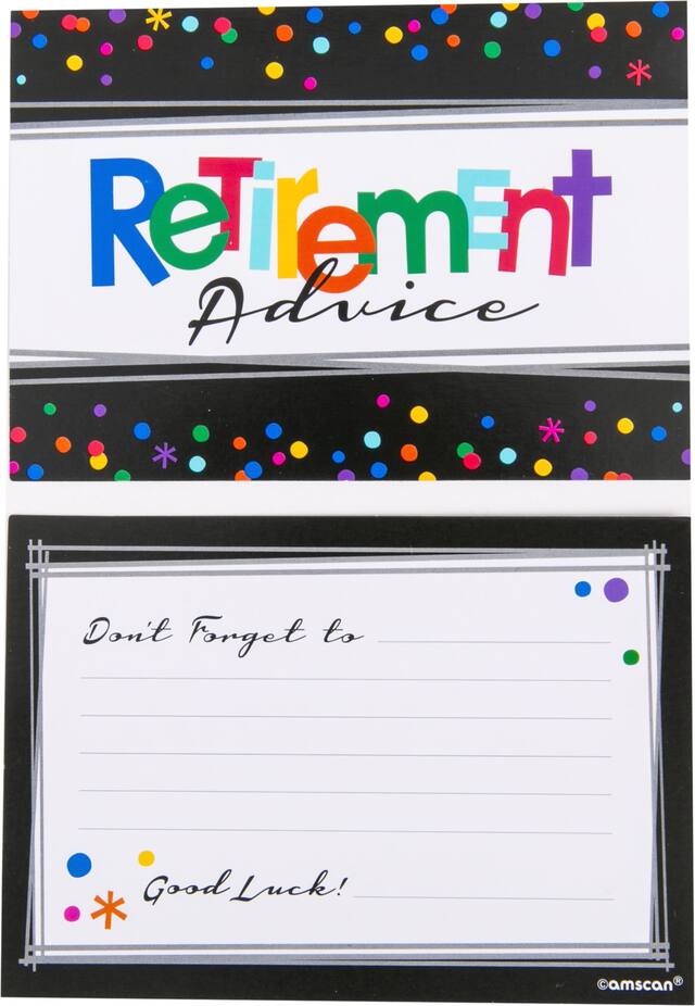Cartes-conseils Bonne retraite affichant les mots « Retirement Advice » d'un côté et offrant des espaces de l'autre côté pour que les invités écrivent leurs perles de sagesse