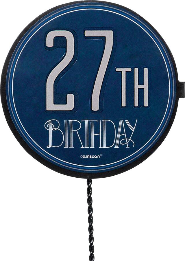 Dessus du centre de table doté d'un papier cartonné rond bleu avec le titre « Happy Birthday to You » blanc d'un côté et d'un espace pour y fixer les autocollants de lettres et de chiffres inclus de l'autre côté