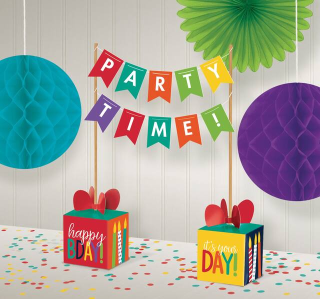 Ces produits similaires présentés ci-dessous pourraient vous intéresser.Centre de table en banderole pour fête d'anniversaire arc-en-ciel constitué d'une banderole à petits fanions formant l'inscription « Party Time »