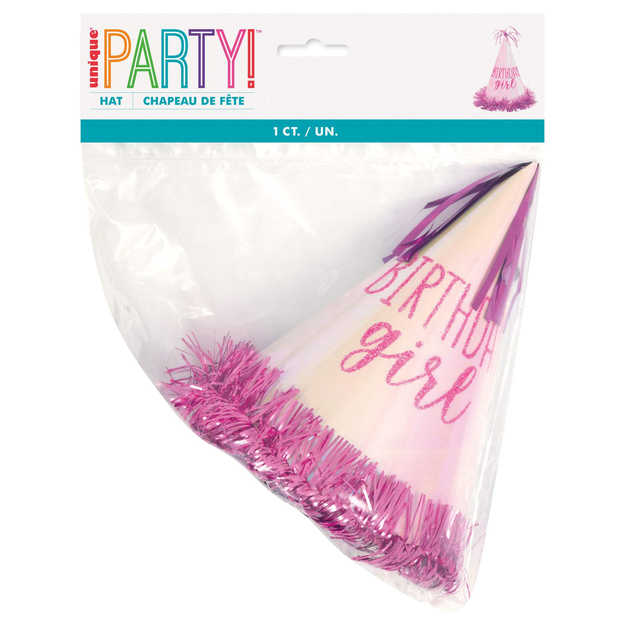 Chapeau rose en forme de cône avec l'inscription Birthday Girl en lettres roses, une frange rose dans le bas et un pompon sur le dessus