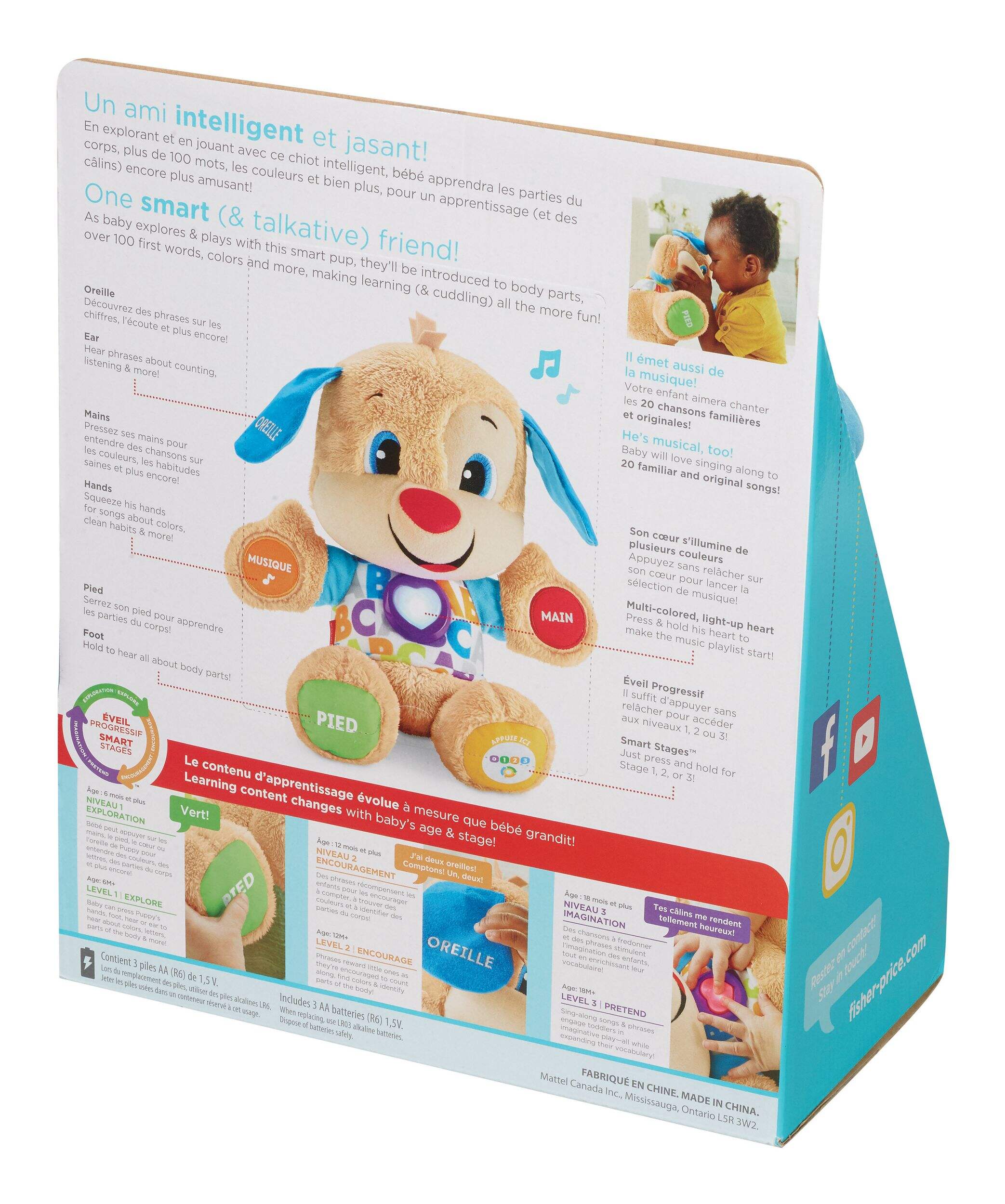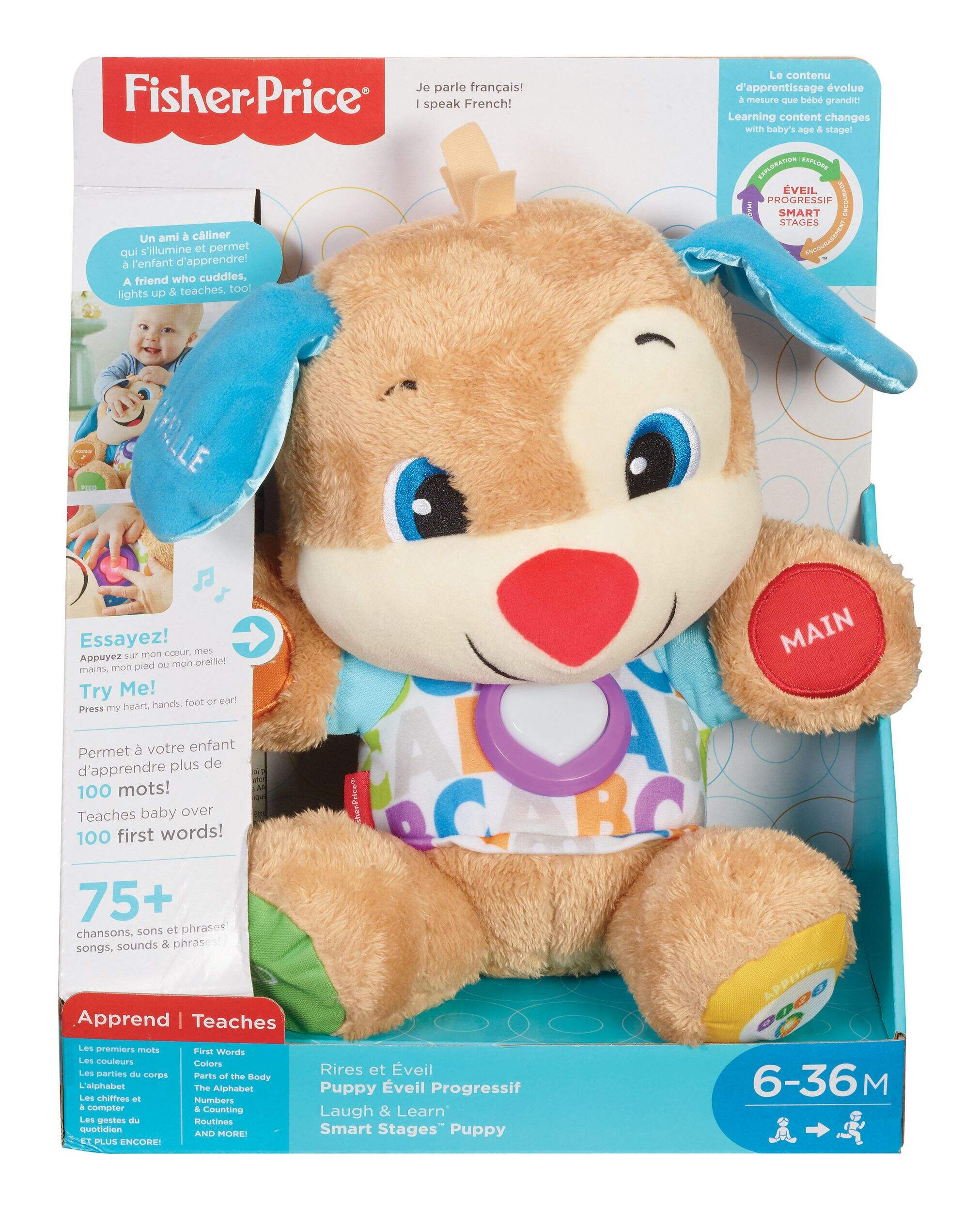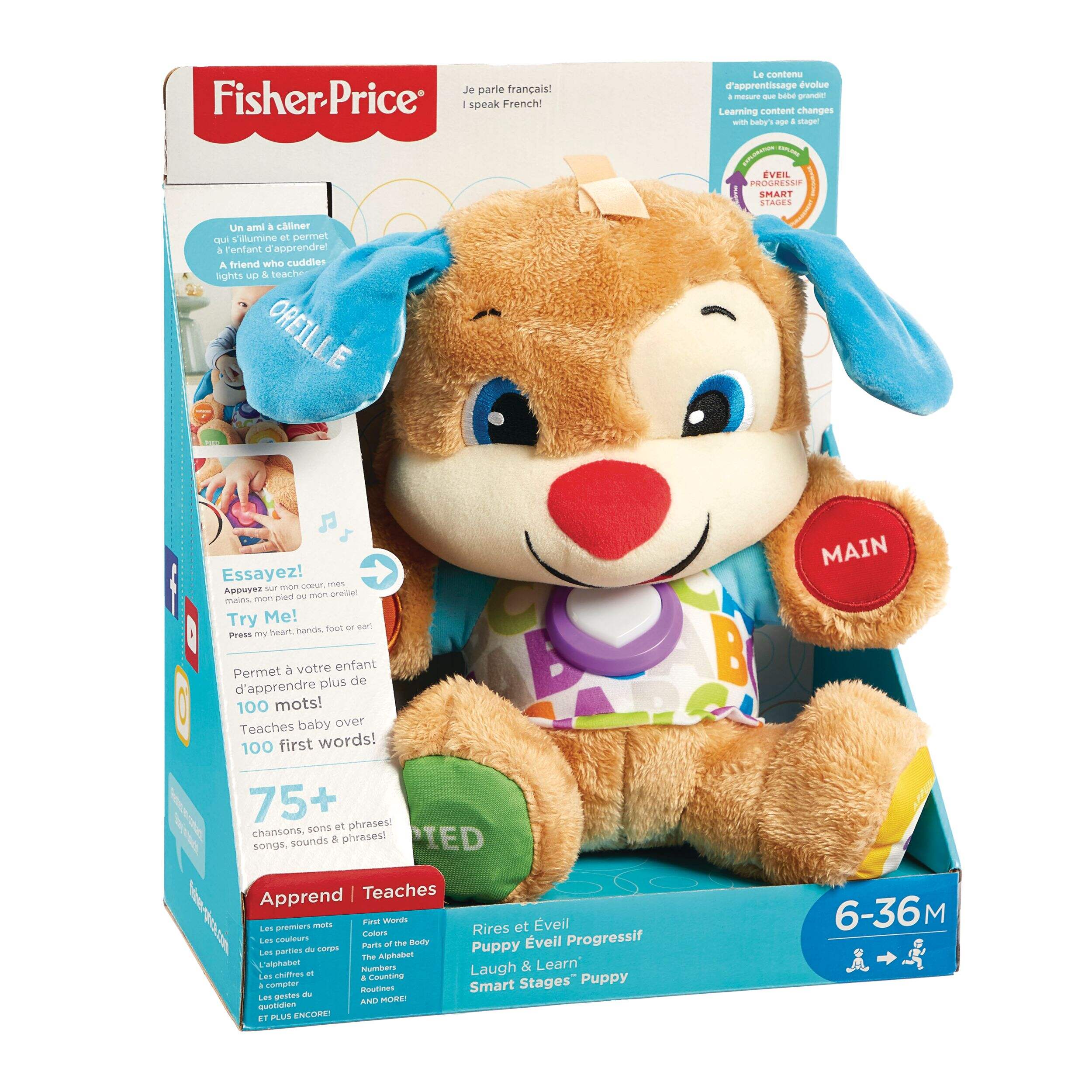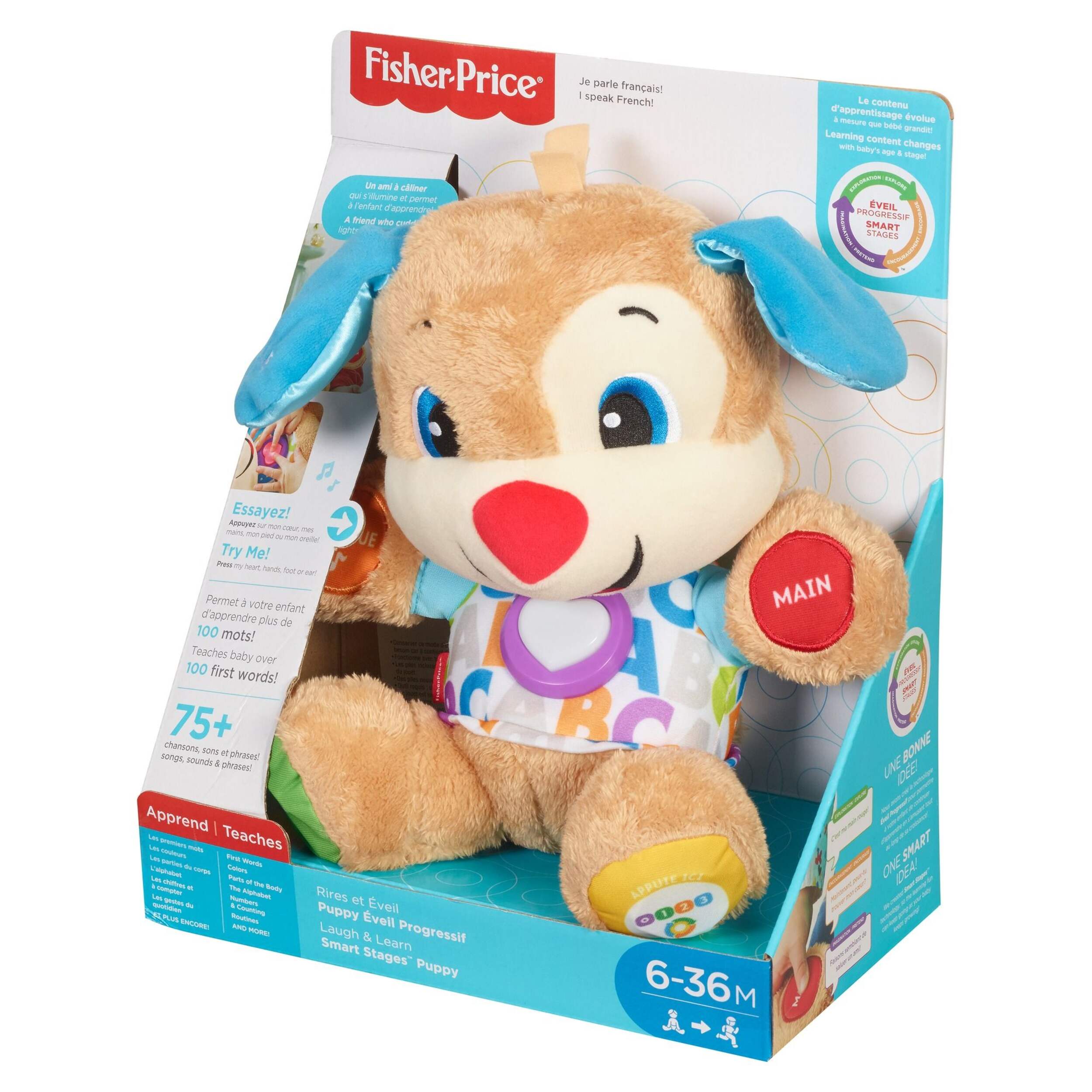 Le chiot Rires et ÉveilMD Éveil ProgressifMC de Fisher-PriceMD est un charmant ensemble de stimulation et d'occasions d'apprentissage en bas âge pour les bébés et les tout-petits. Doux, câlin et coloré, cet adorable jouet pour bébé est prêt à garantir que le plaisir d'apprendre ne se termine jamais. Le jouet en peluche à batterie réagit au toucher de votre bébé avec des chansons à chanter et des phrases stimulantes présentant plus de 100 premiers mots, parties du corps, couleurs, formes et plus encore.