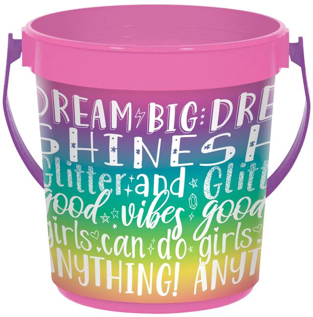 Seau en plastique recouvert d'affirmations comme « Dream Big », « Good Vibes » et « Girls Can Do Anything »