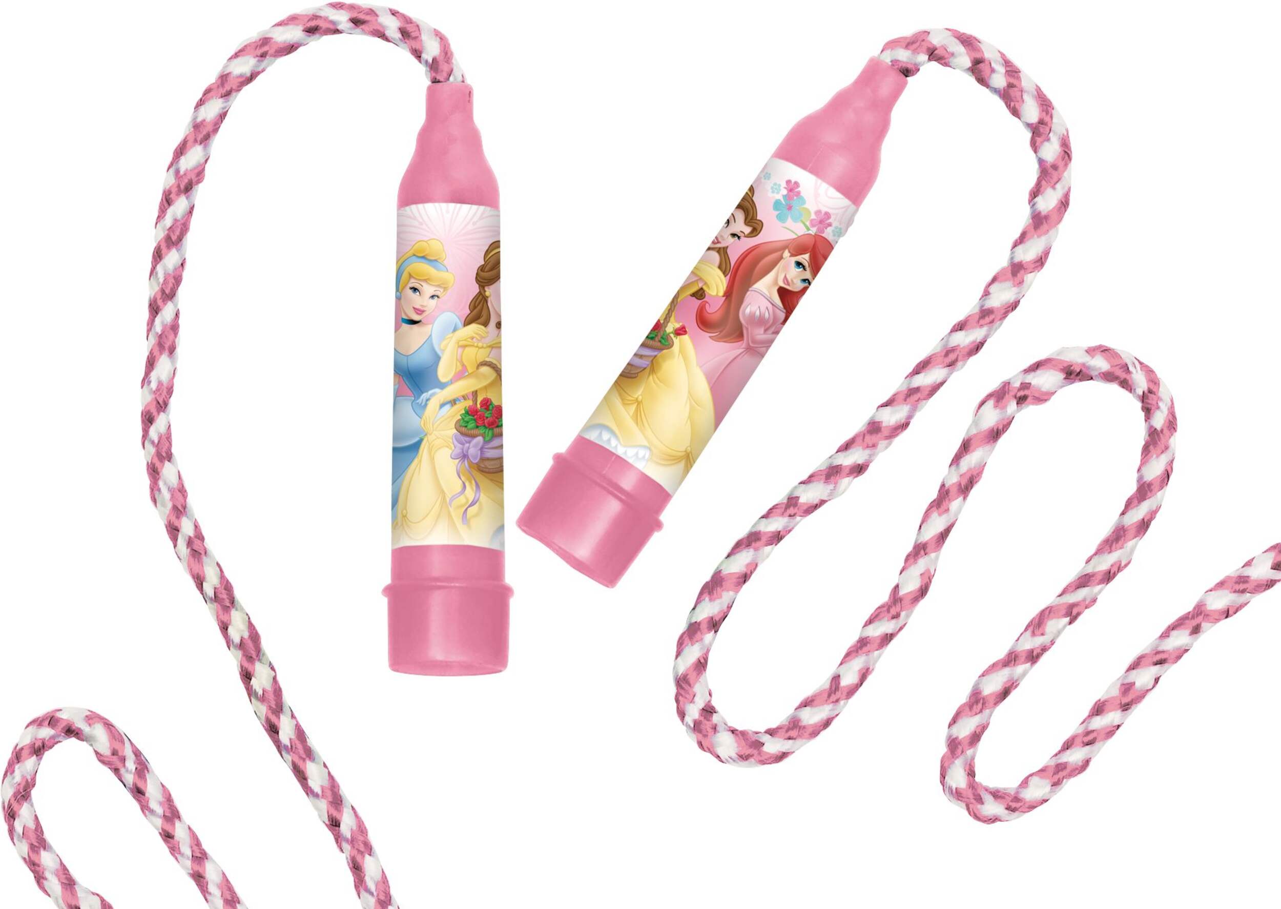 • Comprend une corde en nylon durable rose et blanc et des poignées en plastique rose avec des photos de Cendrillon, Belle et Ariel