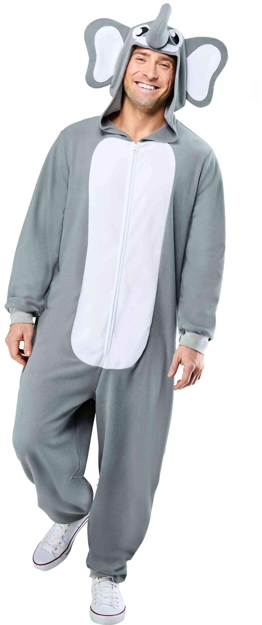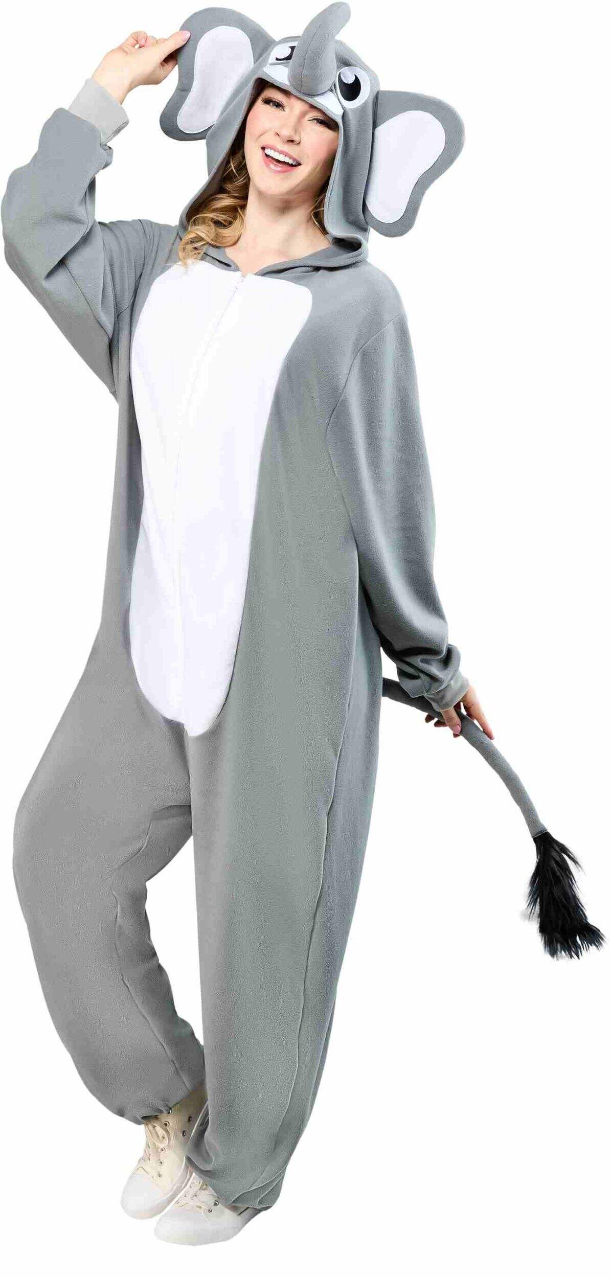Costume comprenant une combinaison grise avec un capuchon à tête d'éléphant et une queue