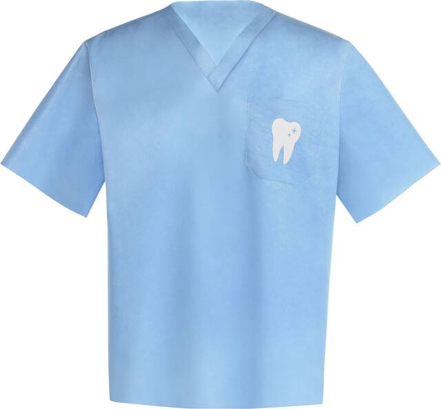 Comprend une chemise à col en V avec une dent étincelante imprimée sur la poche de poitrine, un extracteur de dents surdimensionné, un masque chirurgical et une paire de lunettes de sécurité