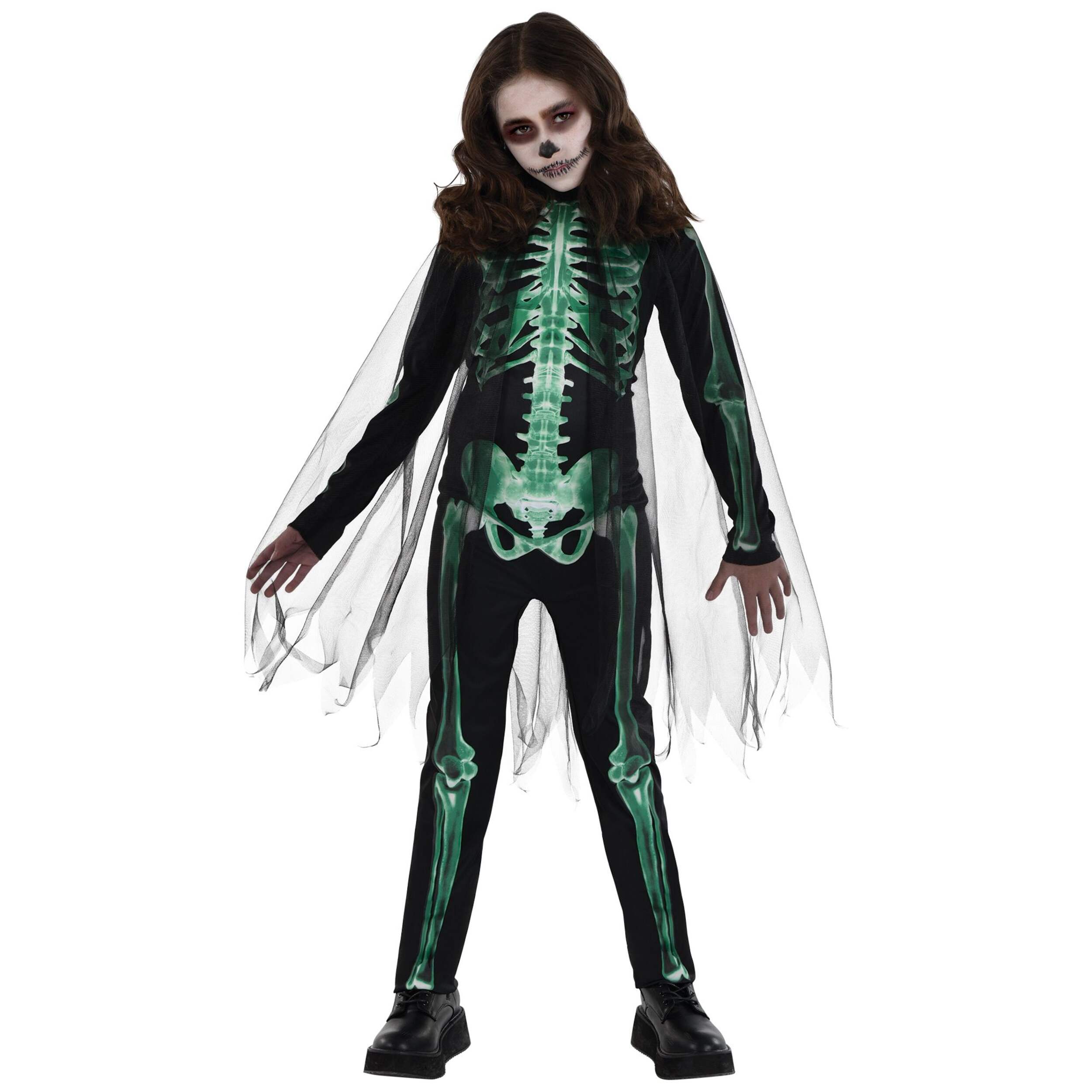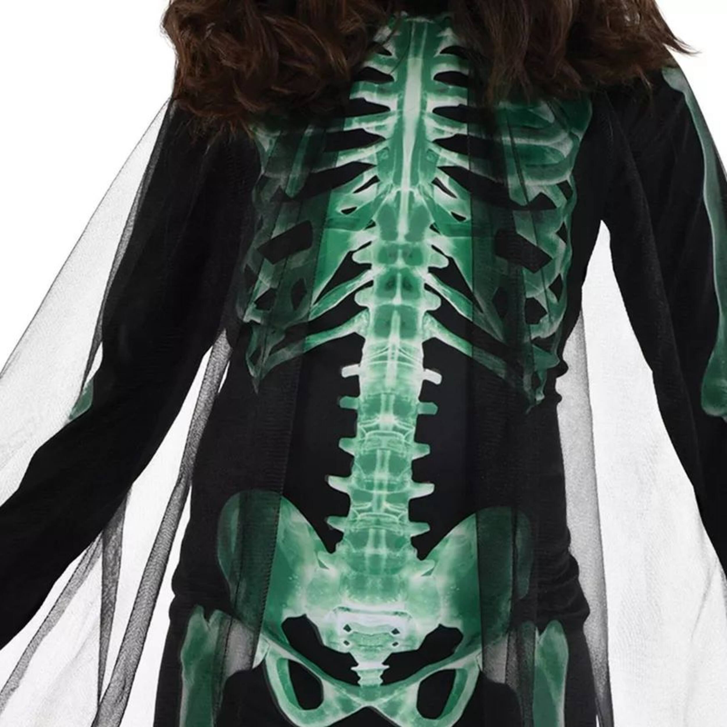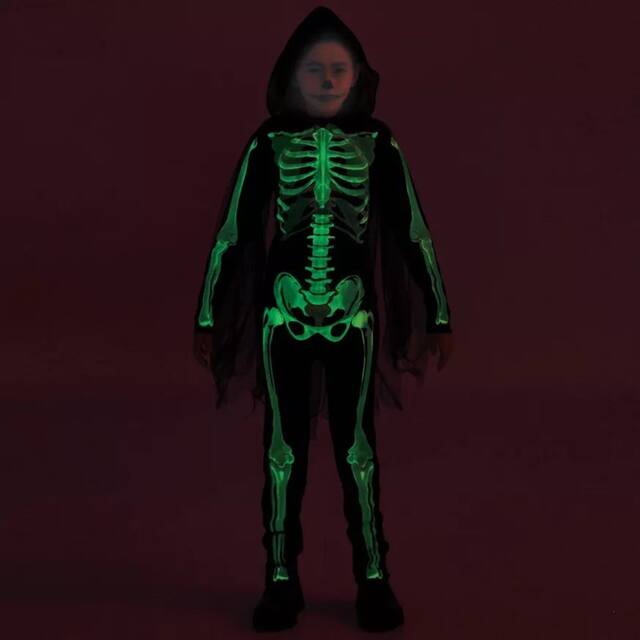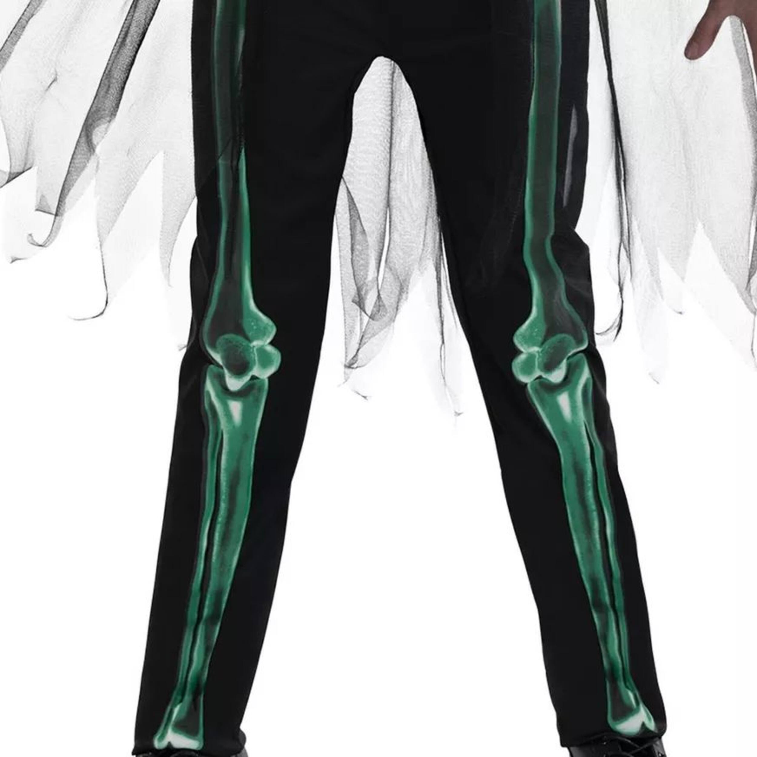 Ils apporteront une lueur étrange la nuit d'Halloween en tant que faucheuse luminescente! Costume doté d'une combinaison noire avec un imprimé de squelette vert fluo phosphorescent