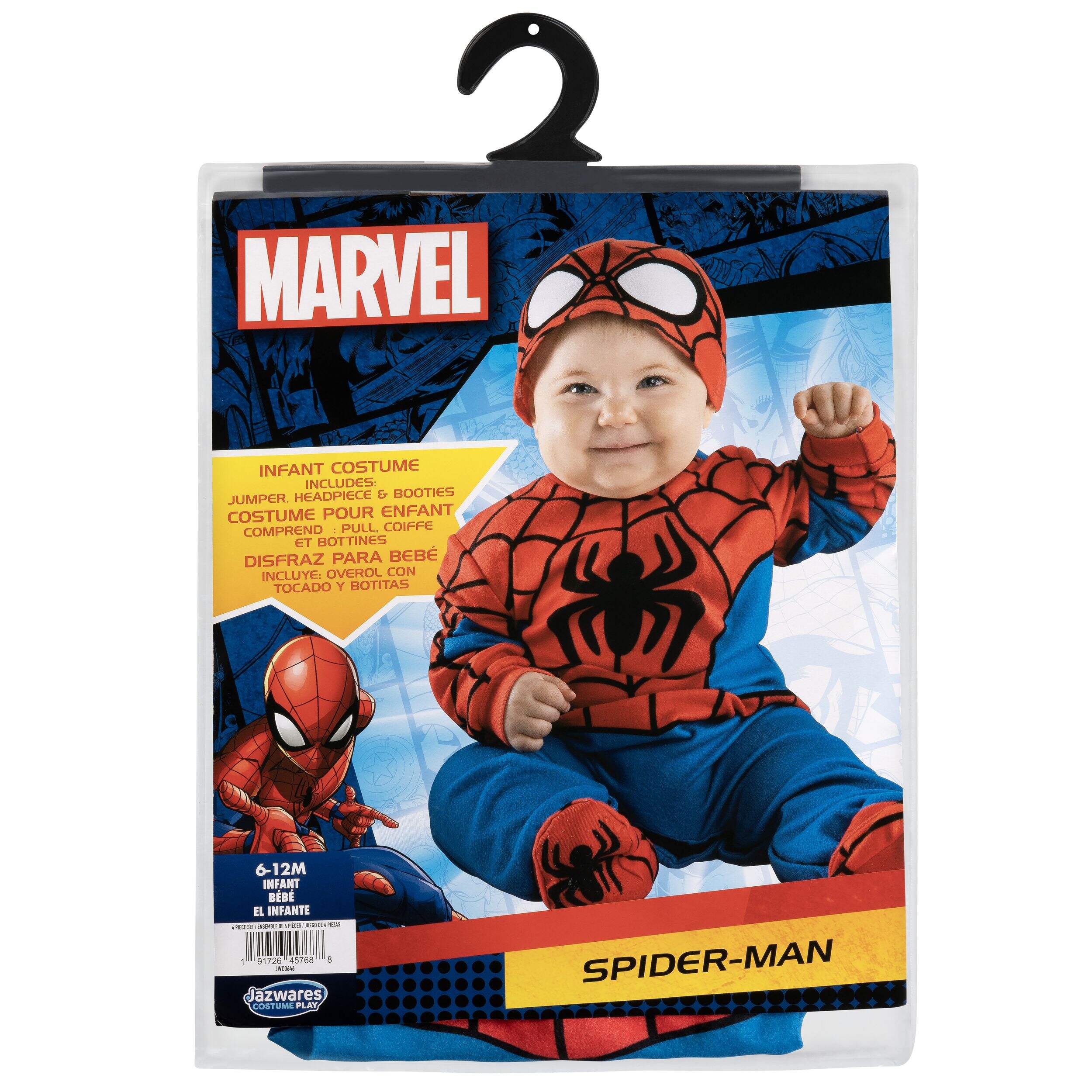 Attention : voici le costume de luxe officiel de Spider-Man de Marvel pour nouveau-nés. Combinaison imprimée basée sur le costume classique de Peter Parker et dotée d'un motif imprimé, d'une fermeture à pression aux jambes et au dos et d'une paire de chaussons antidérapants. Comprend également une coiffe avec le masque emblématique de Spider-Man. Tous les costumes sont faits de matériaux de grande qualité avec des imprimés haute résolution. Jazwares Costume Play crée des costumes pour l'Halloween et des jeux de tous les jours qui sont conçus pour chaque membre de la famille. Article Marvel sous licence officielle de Jazwares. 0 an et plus.