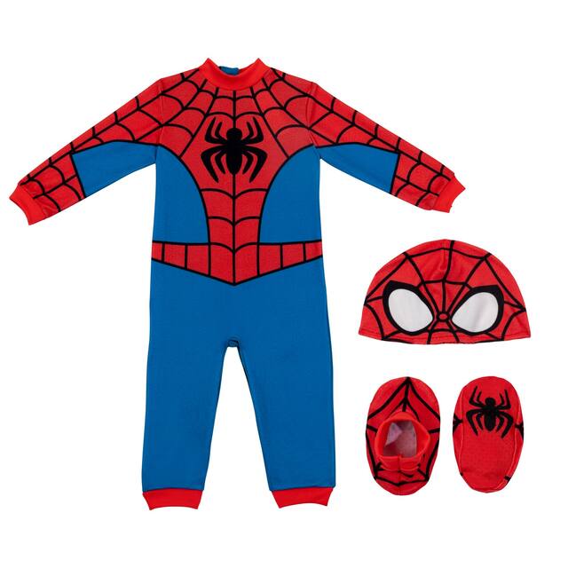 Comprend une combinaison imprimée avec fermeture à bouton-pression aux jambes et au dos, une paire de bottines antidérapantes et une coiffe avec le masque emblématique de Spider-Man