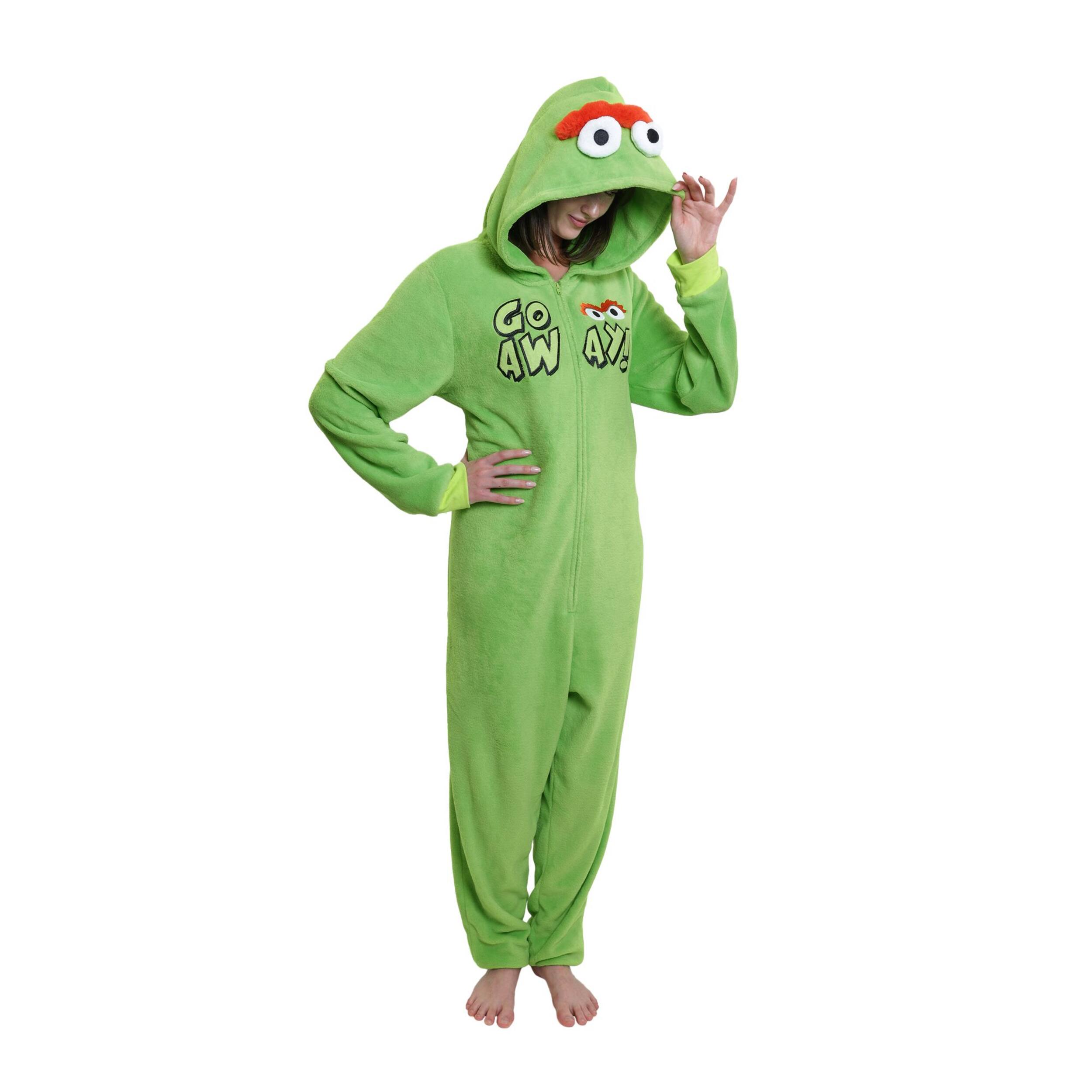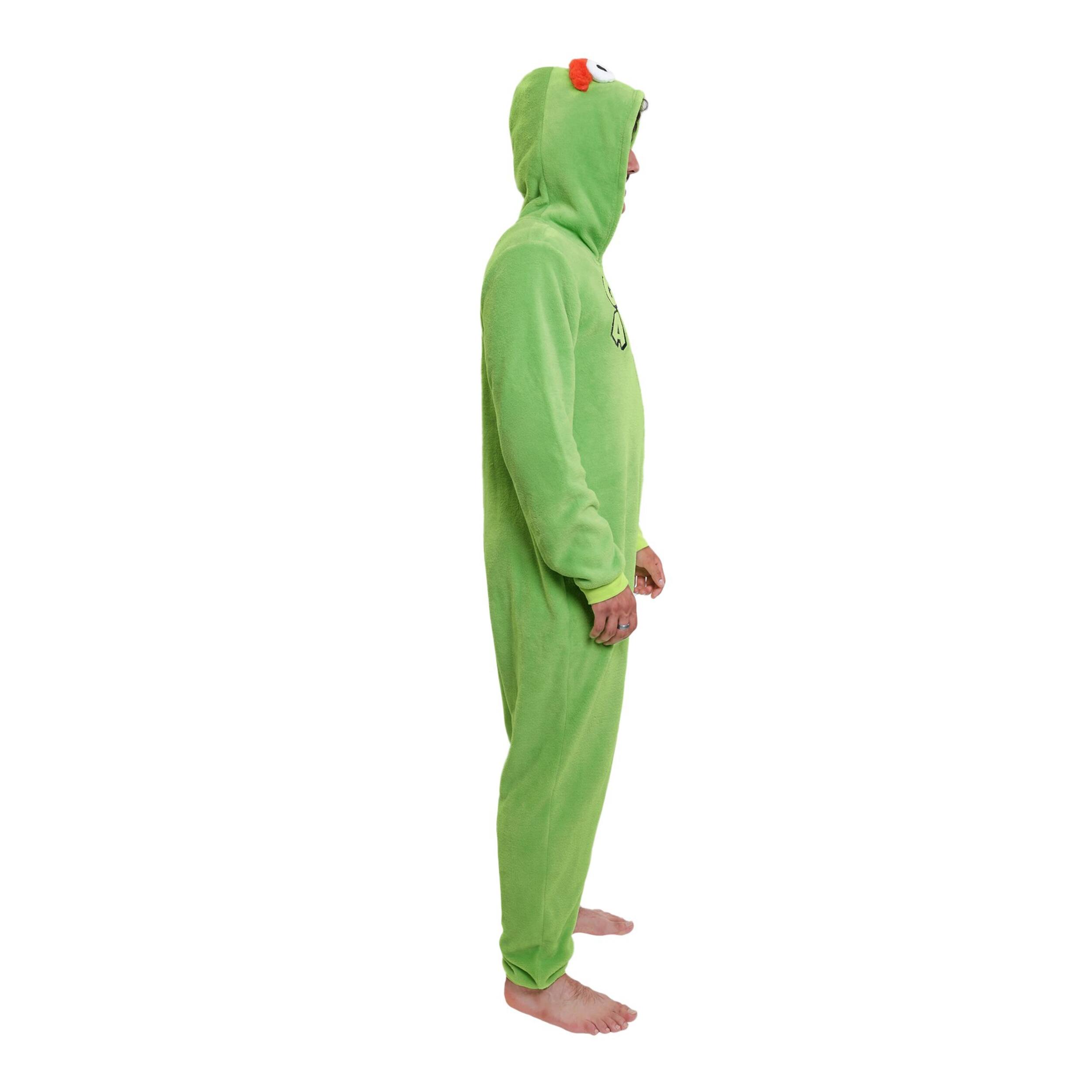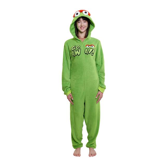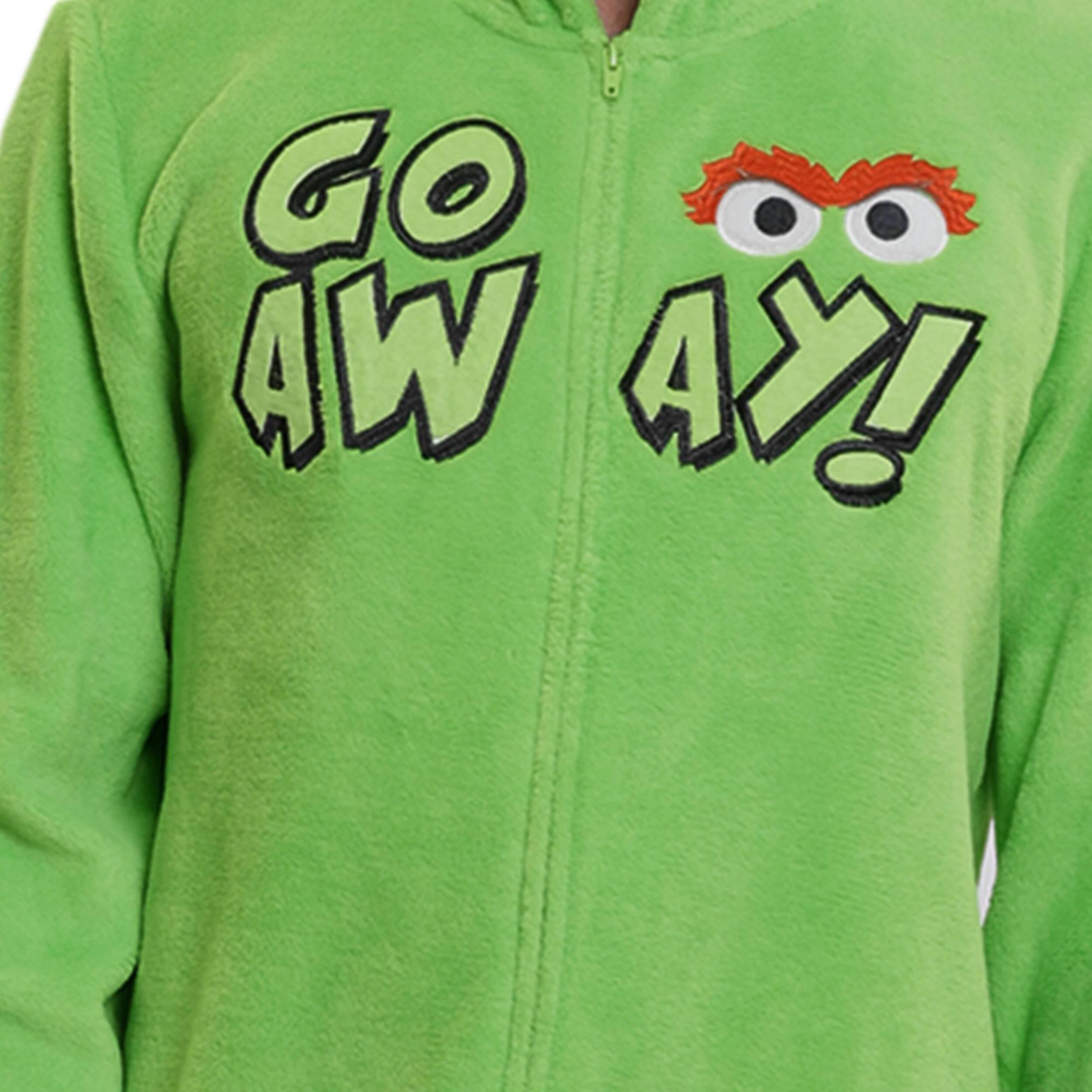 Combinaison verte avec la phrase go away! écrite sur la poitrine et les grands yeux et sourcils d'Oscar sur la capuche