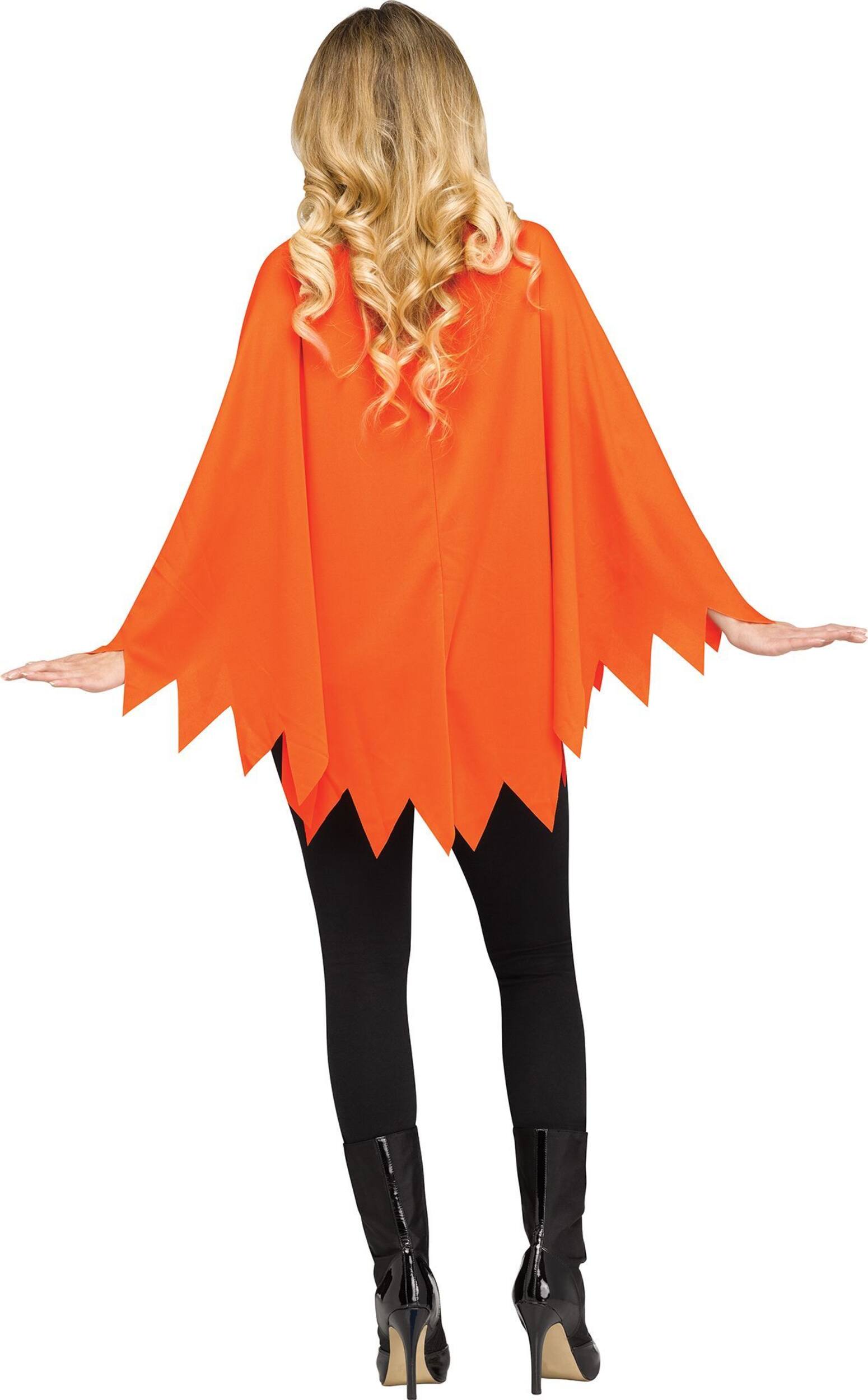 • Poncho en poly à enfiler comprenant un col à feuilles vives et un masque orange et noir en mailles de citrouille heureuse
