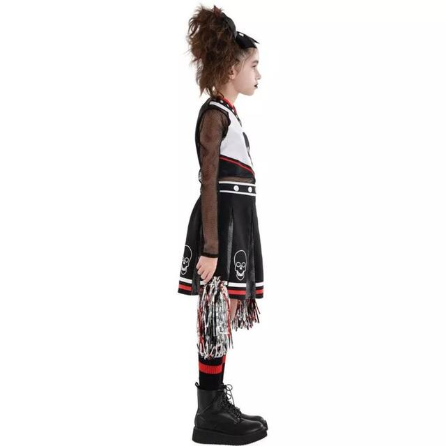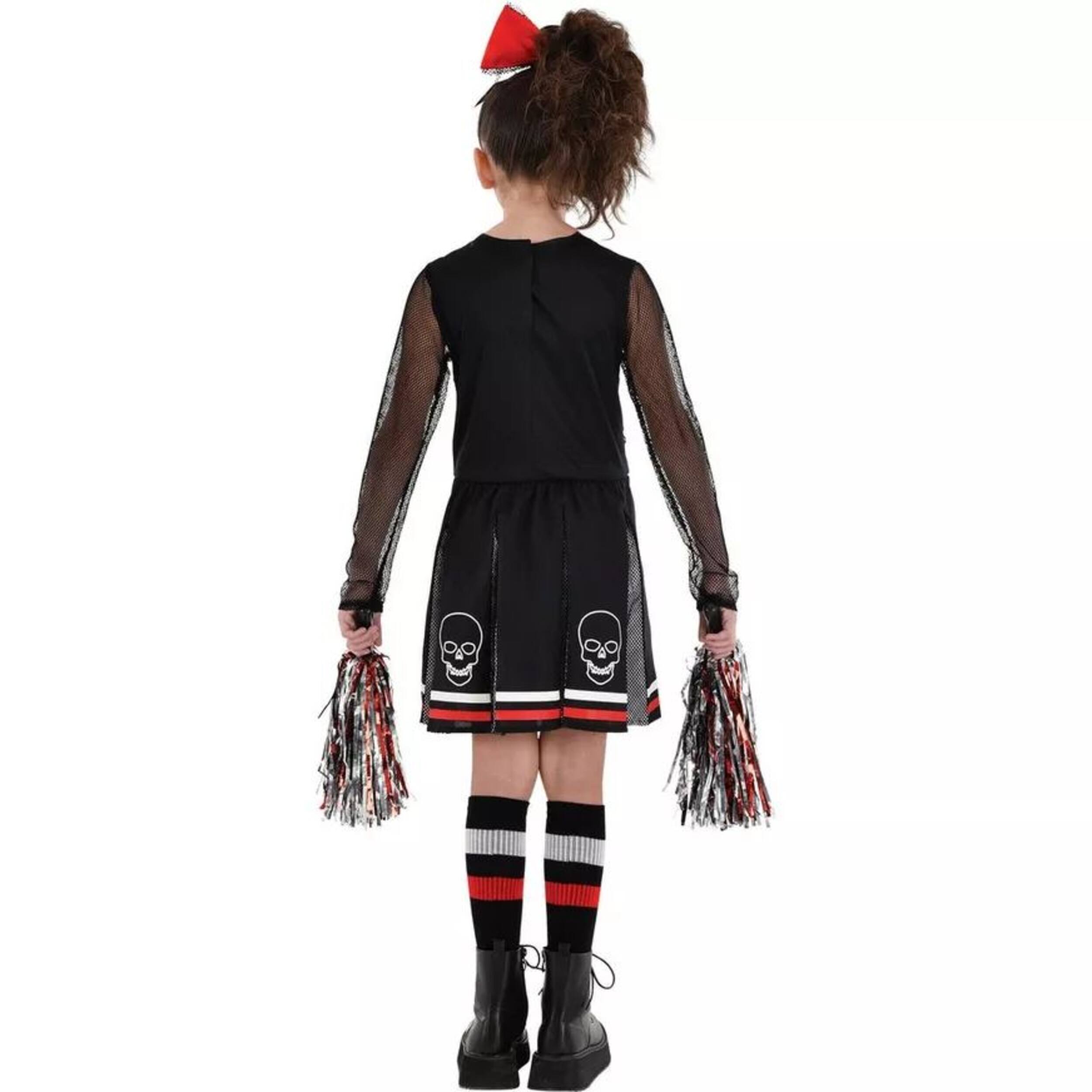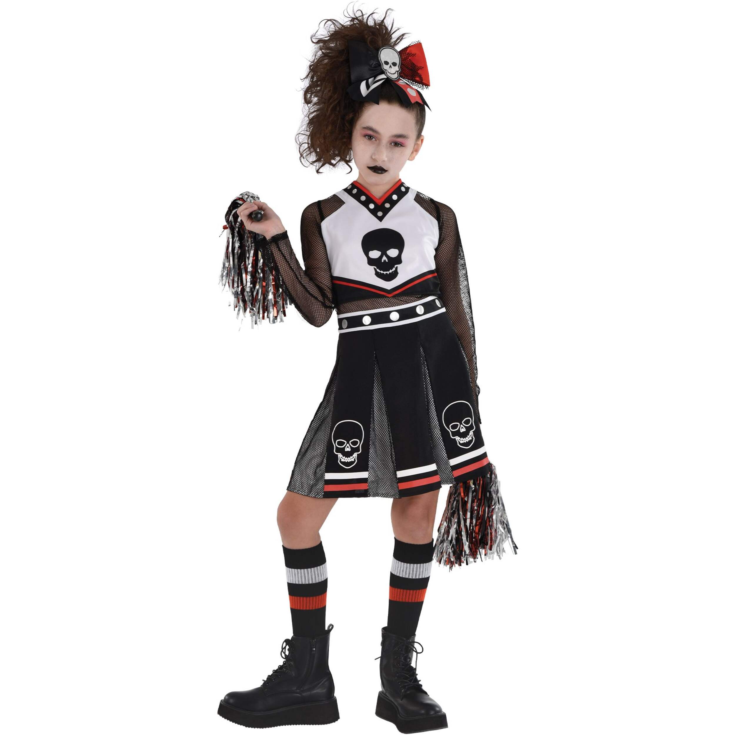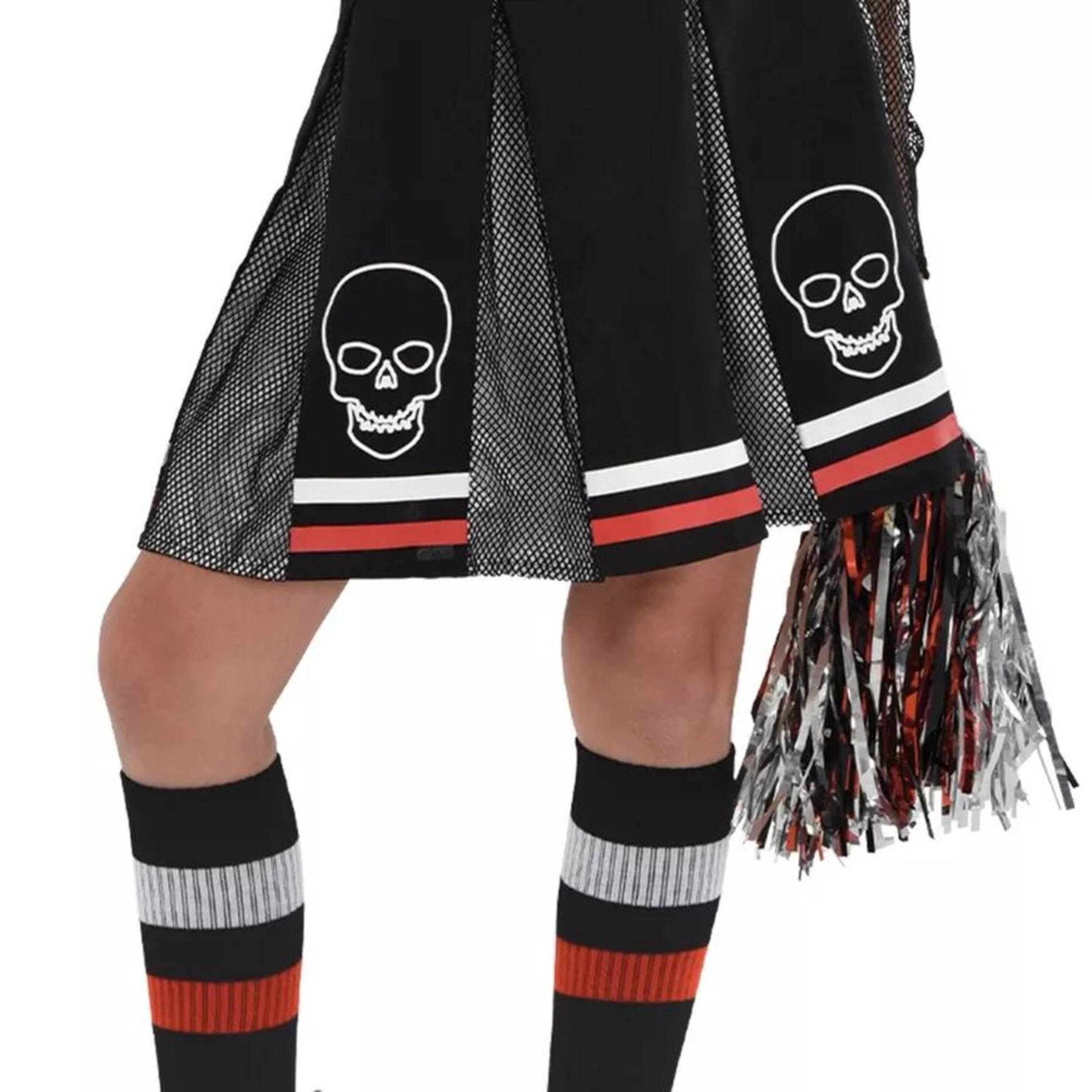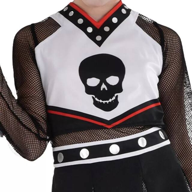 Cette Halloween, la peur sera encouragée lorsqu'elles se déguisent en meneuse de claque Fear Squad! Costume de meneuse de claque d'inspiration punk comprenant une robe avec un haut noir à crâne, des manches noires en filet, des clous argentés imprimés et une jupe plissée