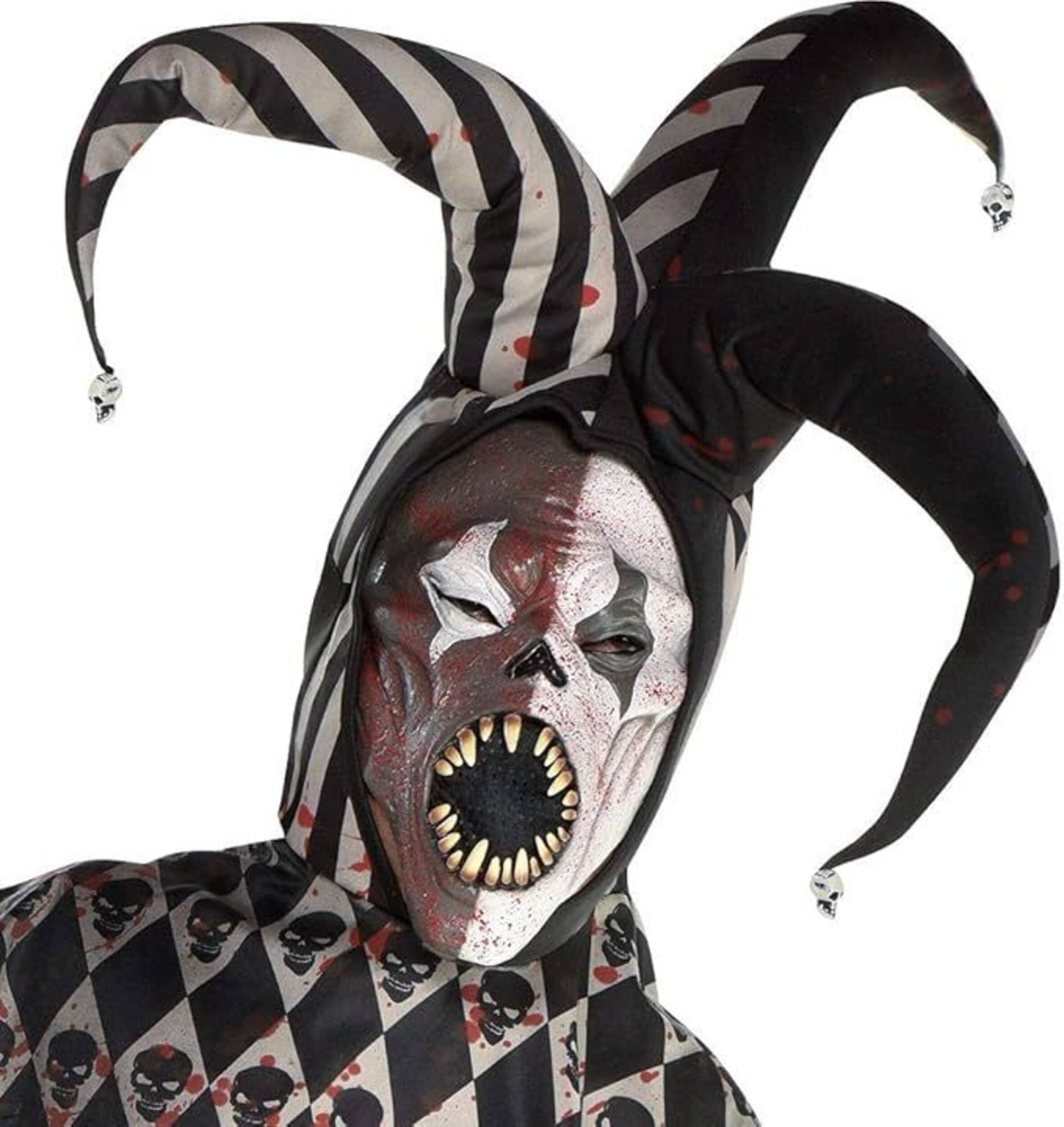 Le costume comprend un masque de bouffon effrayant, une chemise noire en tissu avec un col à imprimé Arlequin, un chapeau blanc et noir, des gants noirs et un pantalon rayé blanc et noir