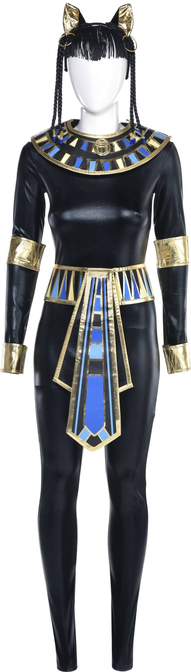 Un catsuit noir avec des détails dorés, un serre-tête noir et doré, un élégant collier noir, bleu et doré et une ceinture assortie