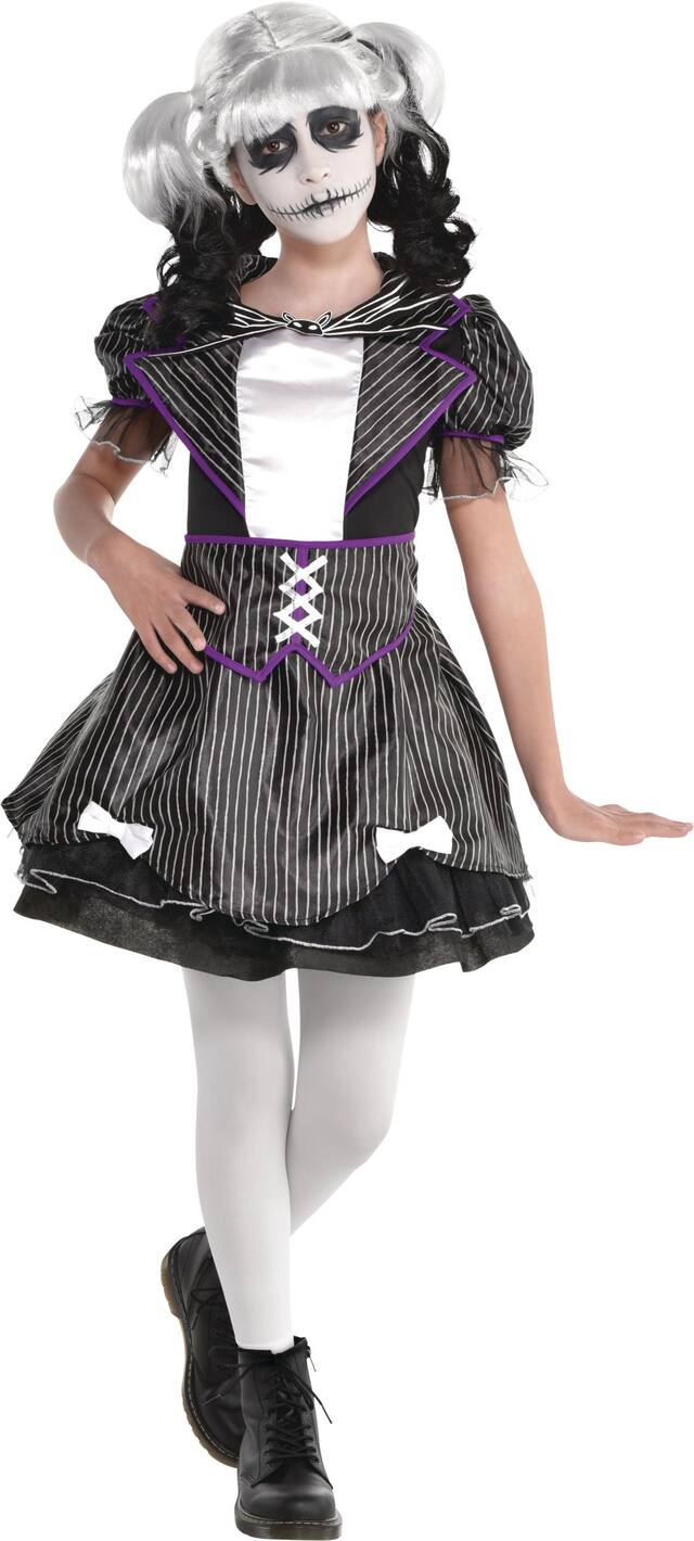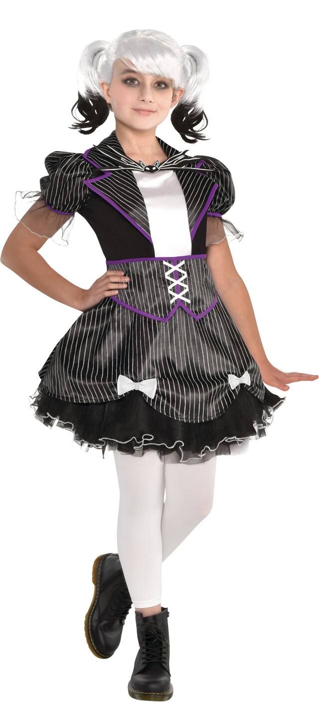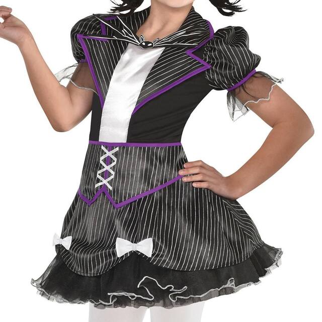 Comprend une robe dessinée d'après le costume rayé de Jack, avec des détails violets et une jupe volumineuse