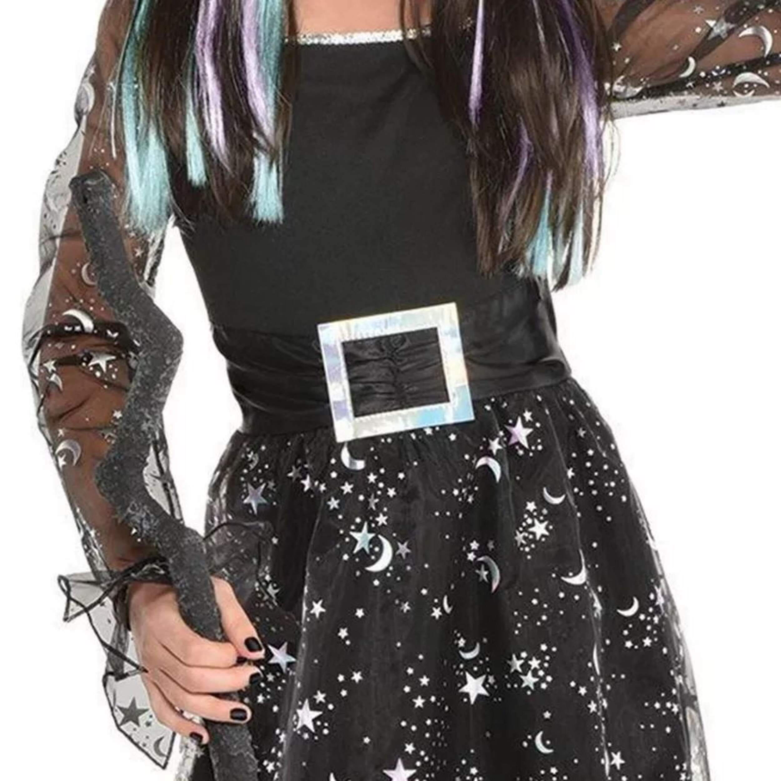 Cette robe et ce chapeau de sorcière créent un costume à faire des potions célestes idéal pour les tout-petits qui aiment la magie à l'Halloween. La robe en velours noir longueur cheville est dotée d'une magnifique superposition transparente violette ornée de spirales scintillantes et de manches cape flottantes faites du même tissu transparent. Une ceinture en tissu iridescent termine la robe. Le chapeau de sorcière en velours noir vient compléter la tenue envoûtante, permettant à votre enfant de transporter les autres chasseurs de bonbons jusqu'à des contrées lointaines d'un coup de baguette magique.