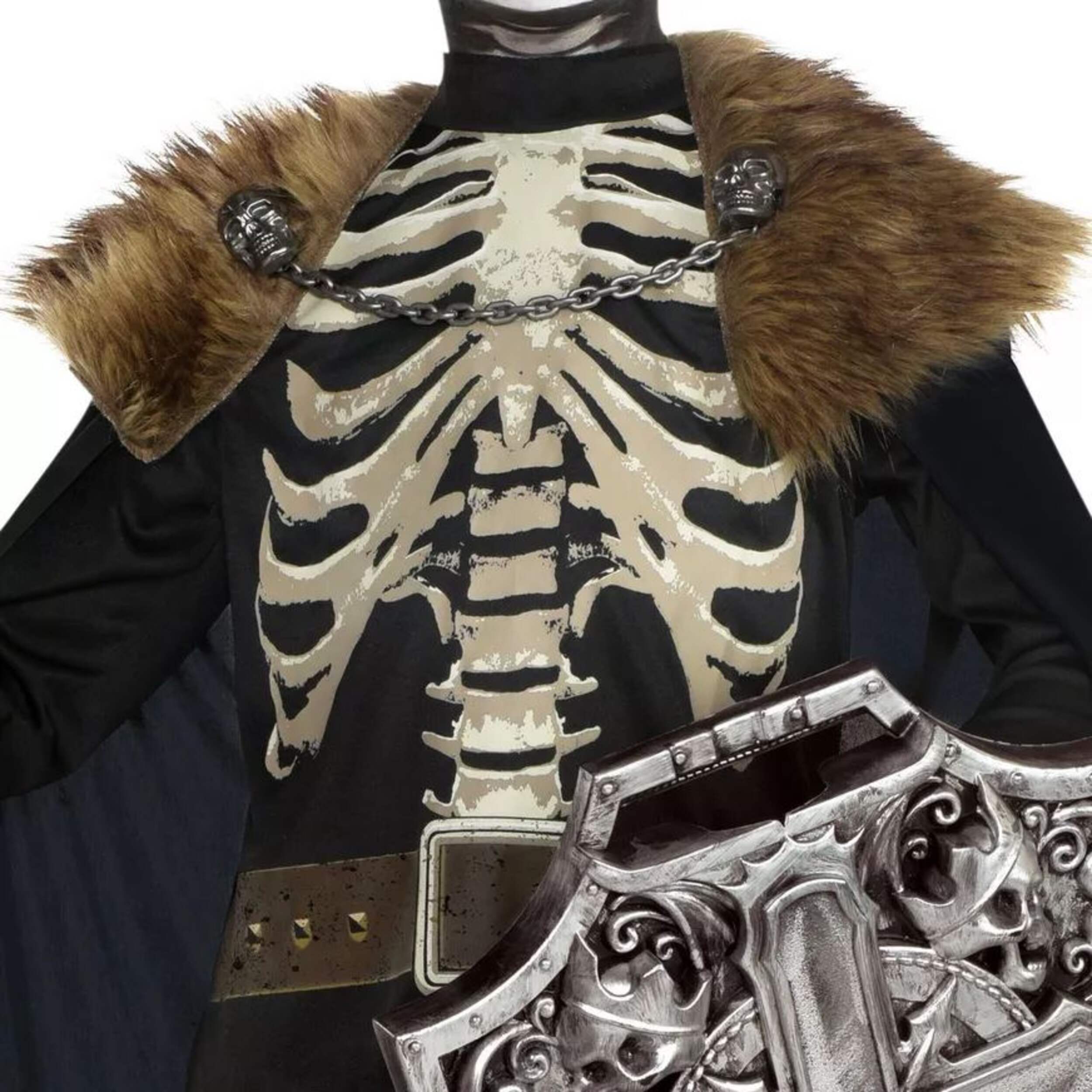 Costume de squelette de chevalier noir noir et blanc pour enfants qui est le costume effrayant idéal pour l'Halloween ou les fêtes costumées. Ensemble comprenant une chemise noire avec un imprimé squelette blanc cassé, une cape noire assortie avec un col en similifourrure amovible, un masque de squelette réaliste et une couronne noire amovible d'aspect métal.