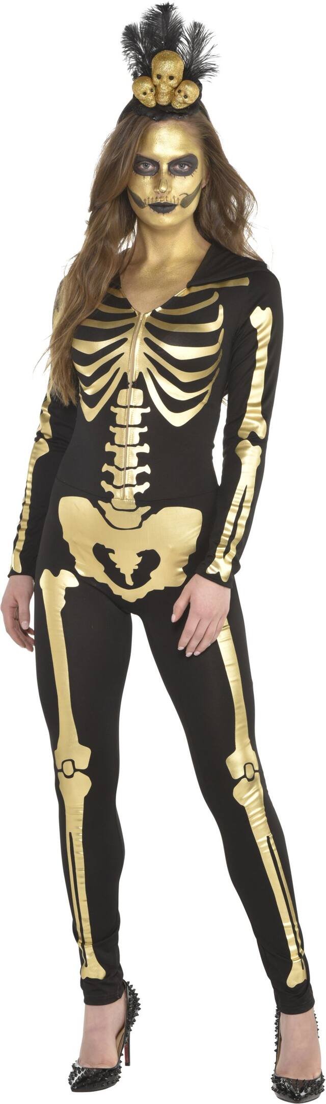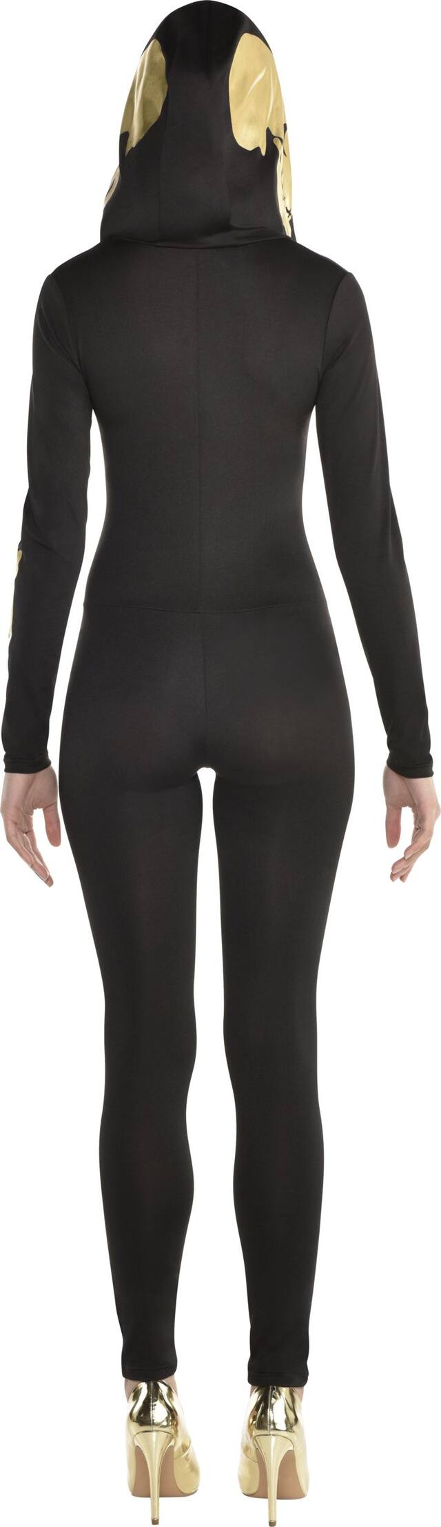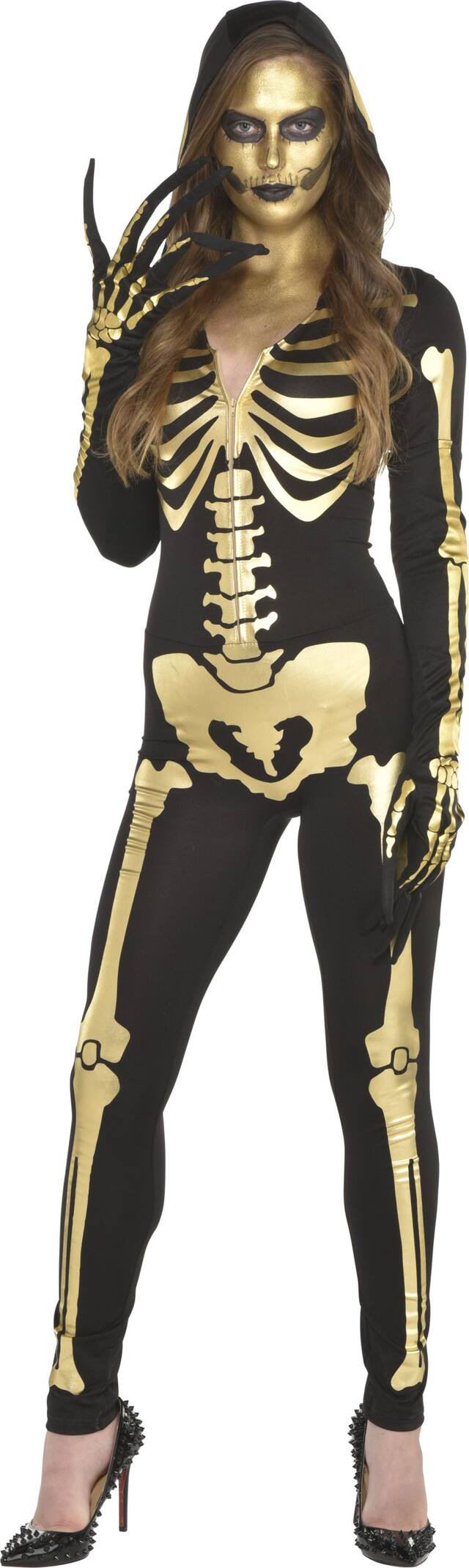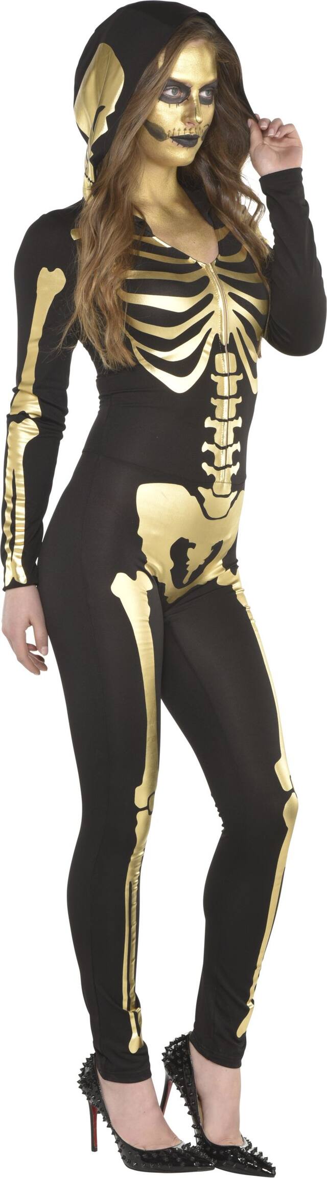 Ces produits similaires présentés ci-dessous pourraient vous intéresser.Costume de squelette 24 carats pour femmes composé d'une combinaison à capuchon noire avec un motif de squelette doré