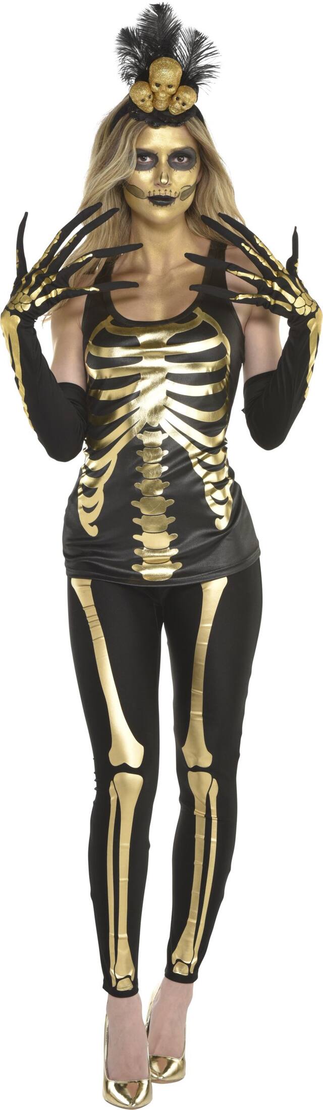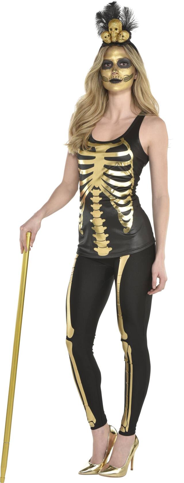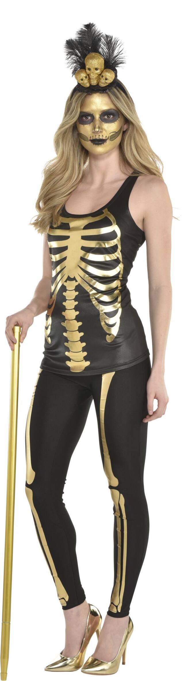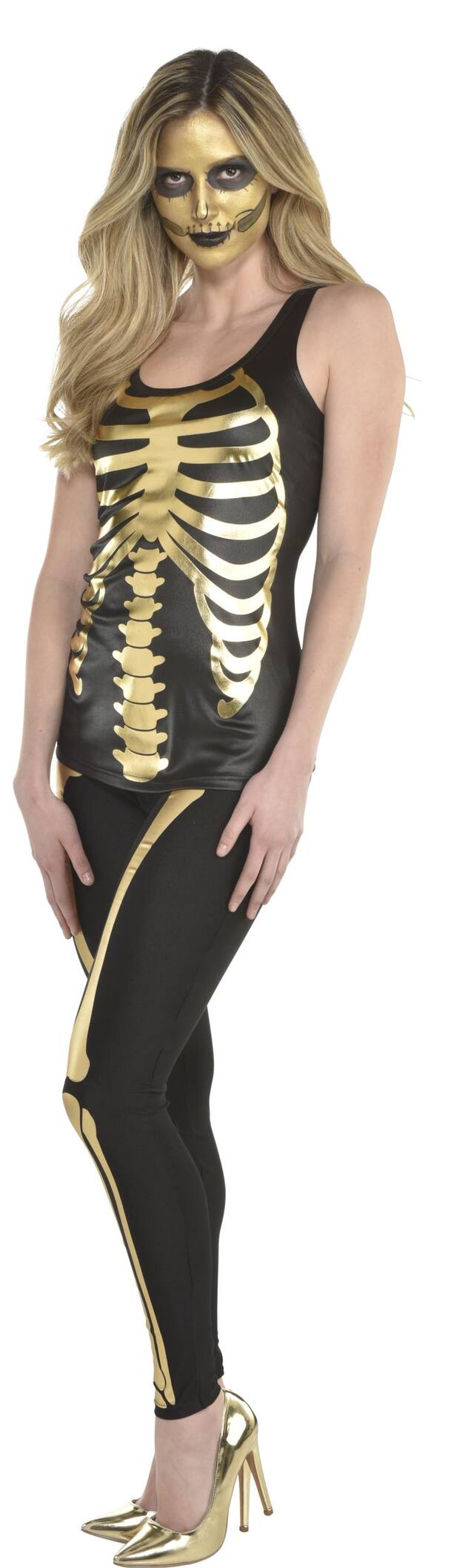 Ces produits similaires présentés ci-dessous pourraient vous intéresser.Costume de squelette 24 carats pour femmes composé d'une combinaison à capuchon noire avec un motif de squelette doré