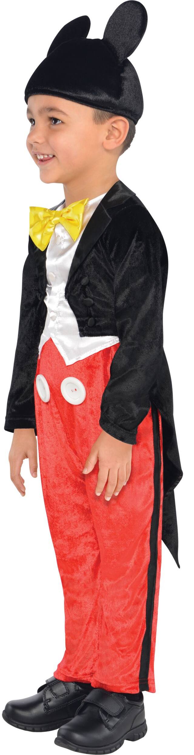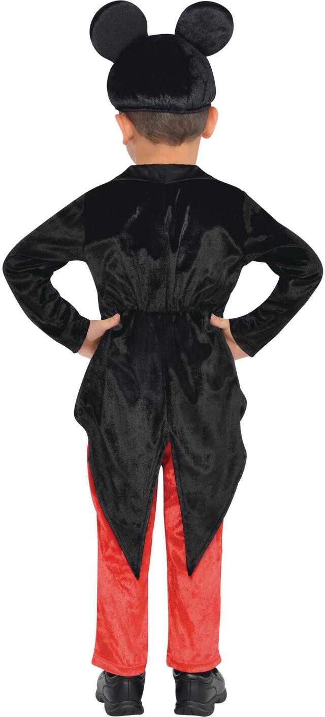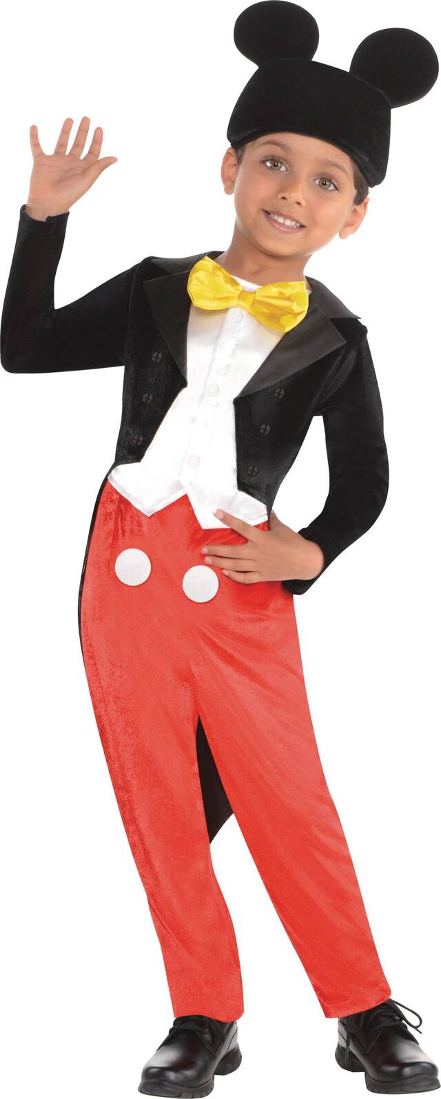Costume Mickey Mouse classique pour enfants qui comprend une combinaison qui ressemble à la tenue classique de Mickey avec un pantalon rouge en satin blanc et une veste de smoking écourtée avec queues