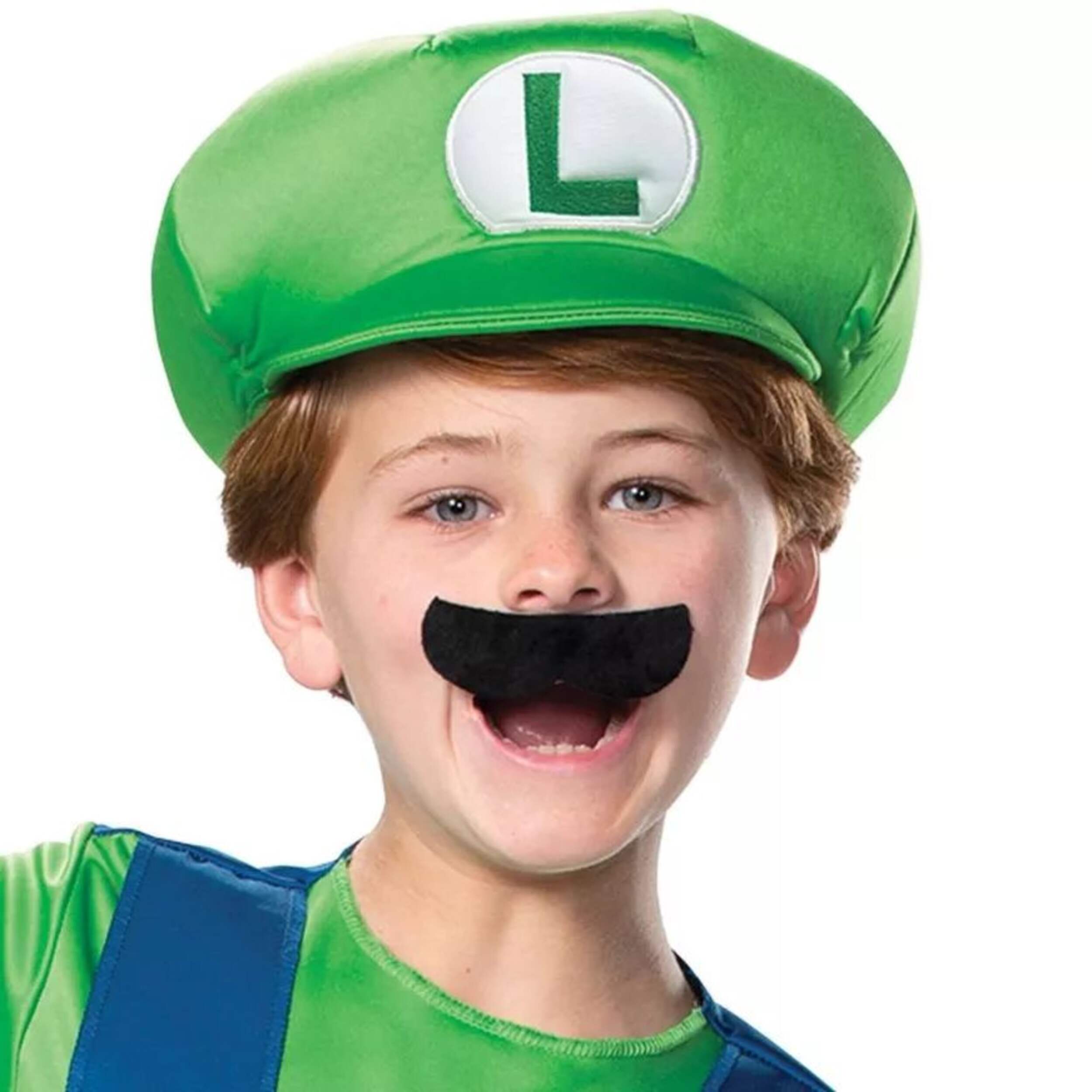 Chapeau vert assorti avec un L pour Luigi et une moustache noire autocollante complétant la tenue