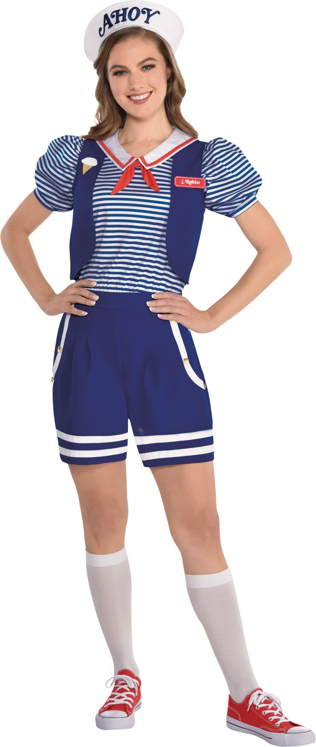 Ces produits similaires présentés ci-dessous pourraient vous intéresser.Costume Scoops Ahoy de Robin, Stranger Things, adultes comprenant une barboteuse bleue et blanche qui est modelée d'après l'uniforme de Scoops Ahoy de Robin avec une veste à rayures bleues et blanches et un short bleu marin