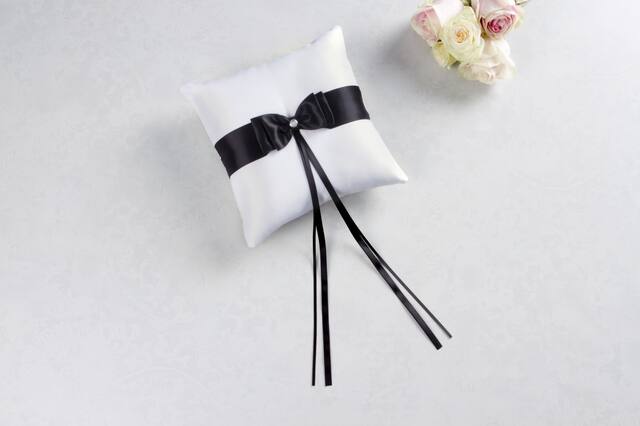Ces produits similaires présentés ci-dessous pourraient vous intéresser.Le coussin pour porteur d'anneau avec boucle noire comprend un coussin pour anneau en satin avec une grande boucle en satin noir et une pierre du Rhin au centre
