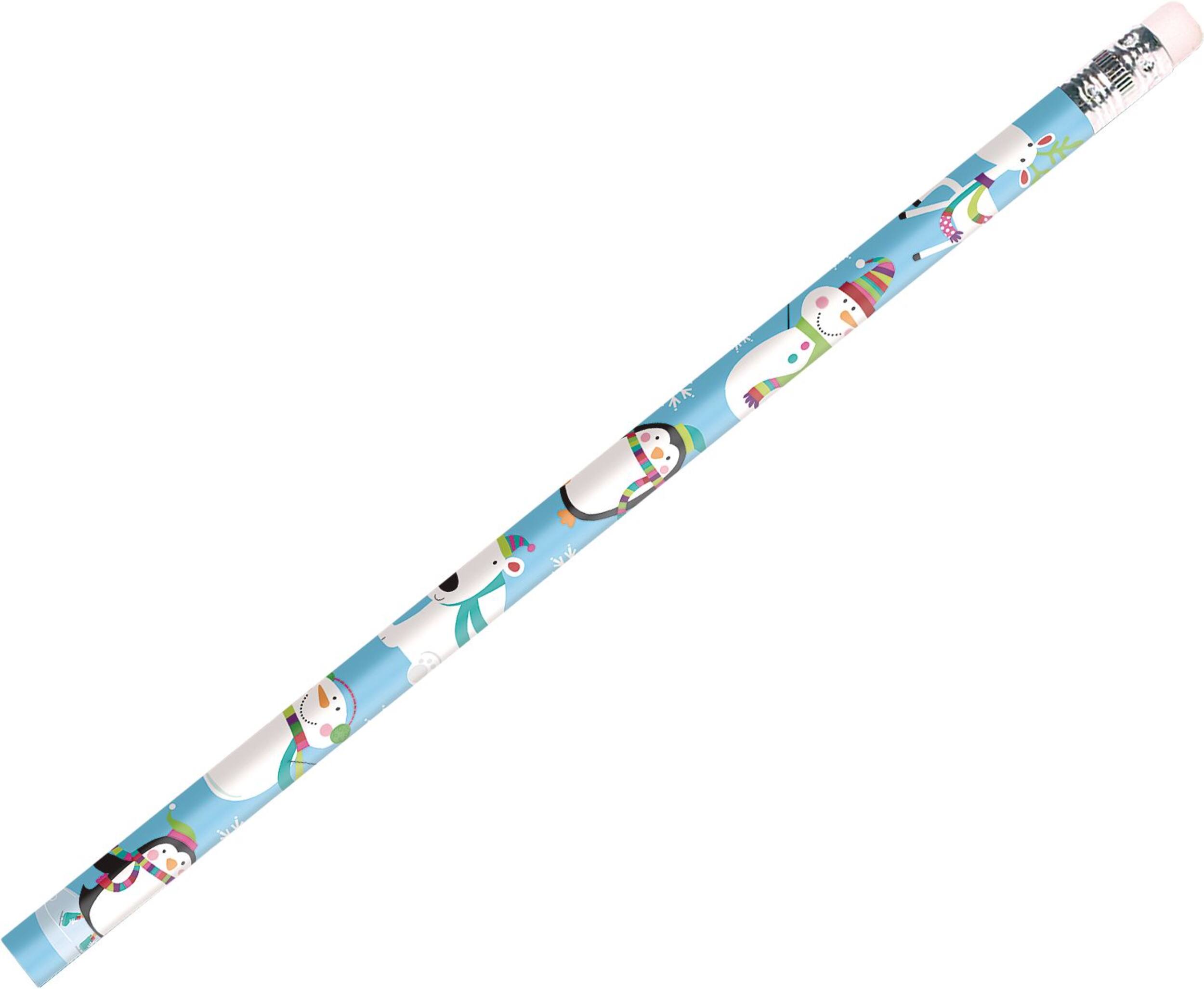 Chaque crayon comprend des bonshommes de neige, des ours polaires, des pingouins et des rennes imprimés sur un fond bleu pâle