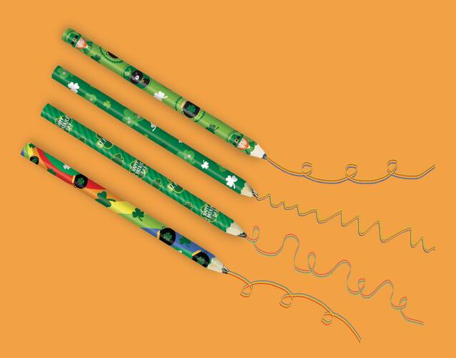Ces produits similaires présentés ci-dessous pourraient vous intéresser.Crayons multicolores trèfle dotés de motifs extérieurs verts avec des farfadets, des trèfles et des arcs-en-ciel